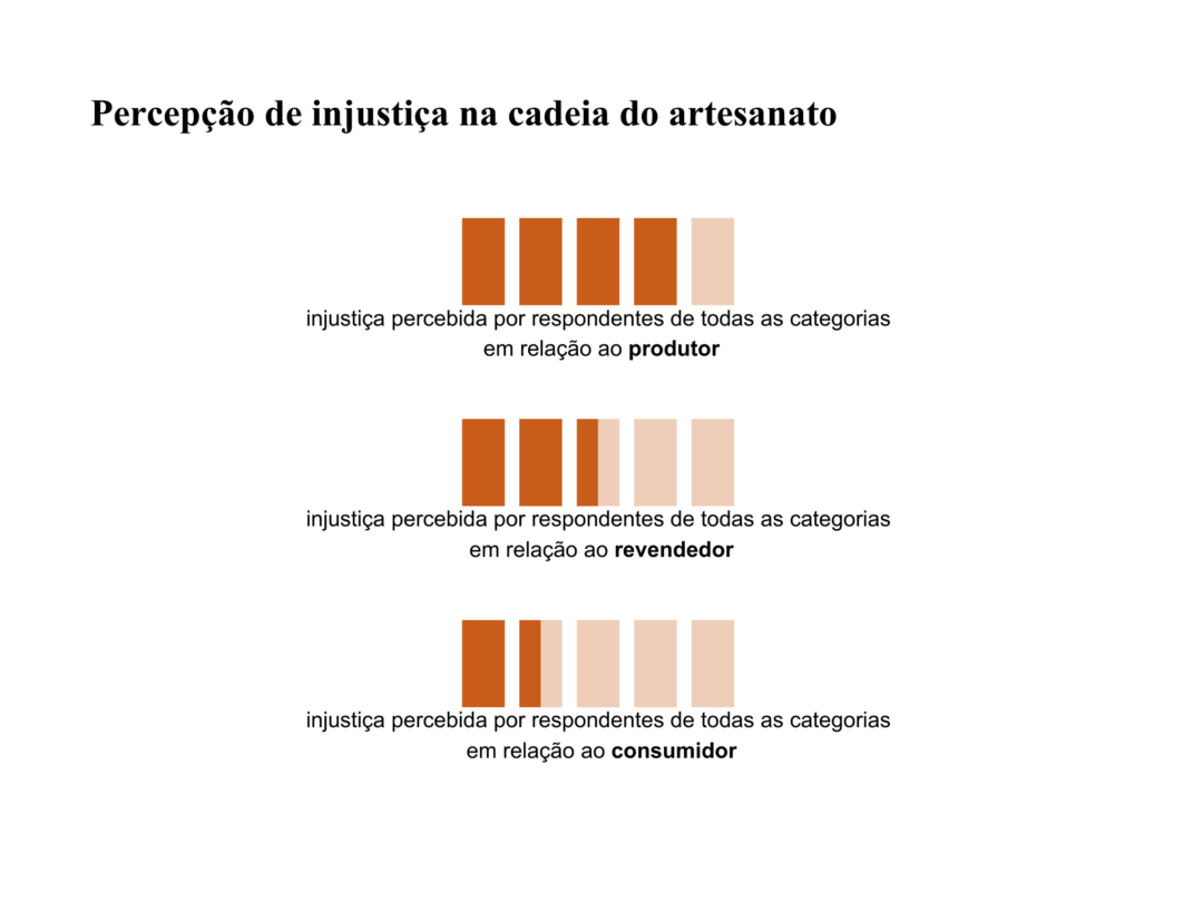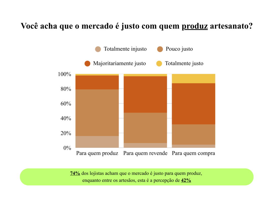 79% dos respondentes consideram o mercado “pouco justo” ou “totalmente injusto” com quem produz artesanato. Dentro desse grupo, 47% são artesãos, 28% consumidores, 15% representantes institucionais ou governamentais, 5% lojistas e 5% pesquisadores. À medida que se avança na cadeia, a percepção muda: o mercado é visto como “justo na maioria das vezes” ou “totalmente justo” por 52% dos respondentes quando se trata da revenda e por 69% quando o foco é o consumidor final. Os dados indicam uma percepção do sistema como mais favorável para os elos finais da cadeia do que para quem produz.