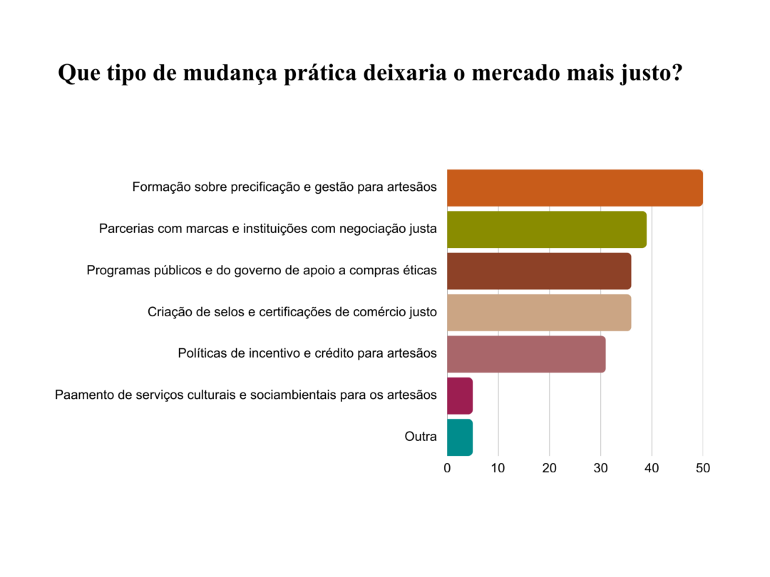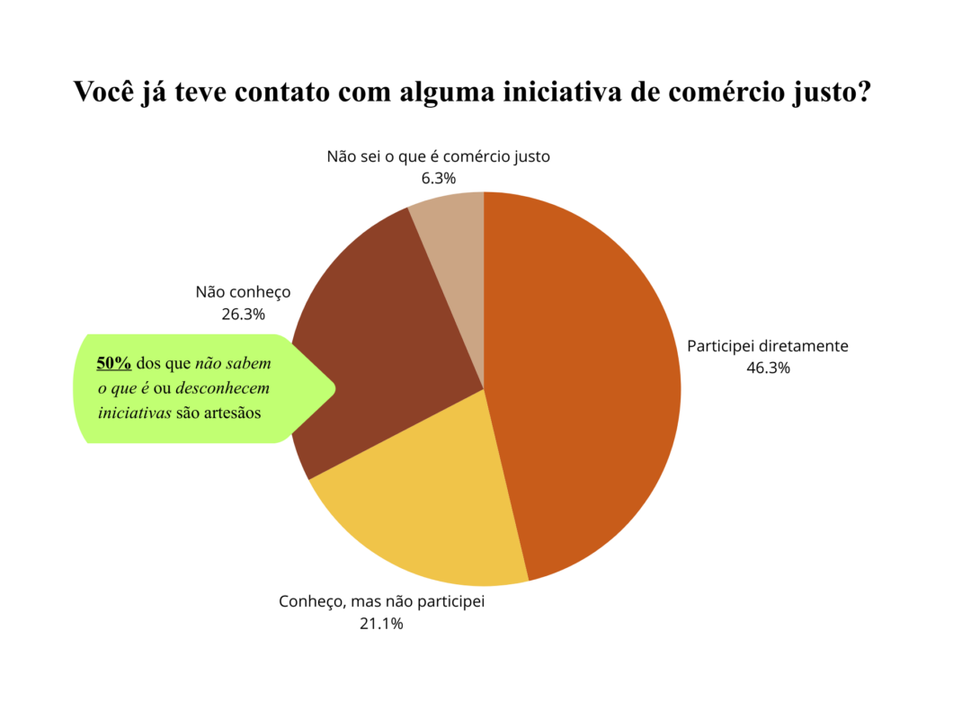 A pesquisa revela uma relação ambígua com o comércio justo: 46% dos respondentes já participaram diretamente de iniciativas desse tipo, enquanto 32% não conhecem o conceito ou experiências associadas — e metade desse grupo é formada por artesãos.