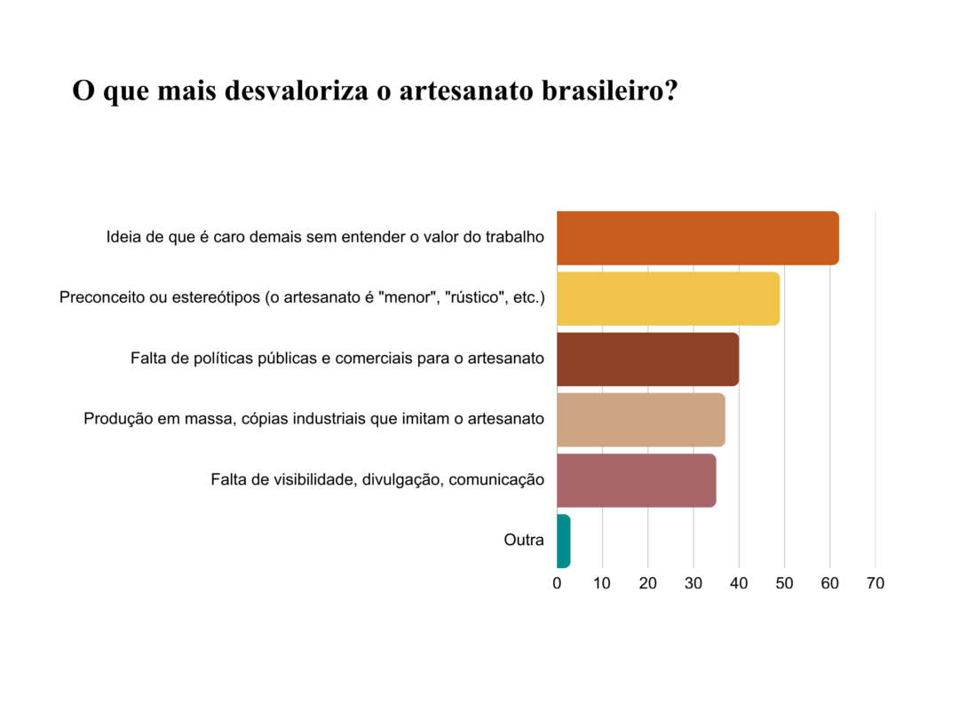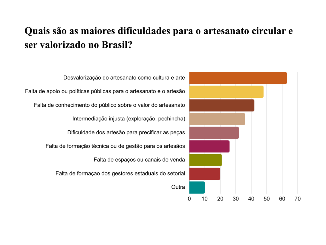 A pesquisa buscou identificar quais são, na percepção dos respondentes, os entraves que impedem o artesanato de circular e ser valorizado no país. A lista a seguir, elaborada a partir das opções mais selecionadas em pergunta de múltipla escolha, revela que os obstáculos mais citados não estão ligados apenas à venda em si, mas a uma combinação de fatores simbólicos, institucionais e econômicos.