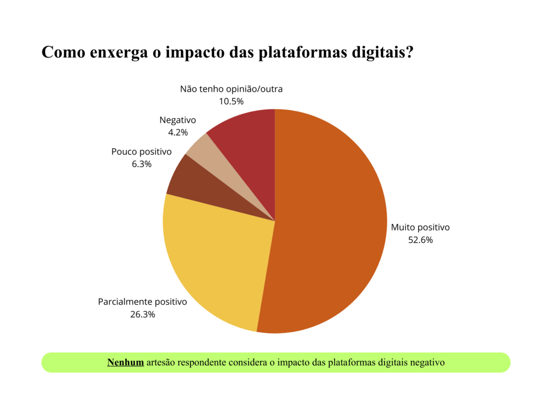 Não há rejeição às ferramentas contemporâneas de venda. Para 79% dos respondentes, as plataformas digitais são vistas como positivas para a circulação do artesanato, o que indica abertura a novos modelos de comercialização.