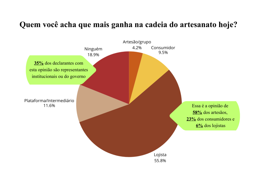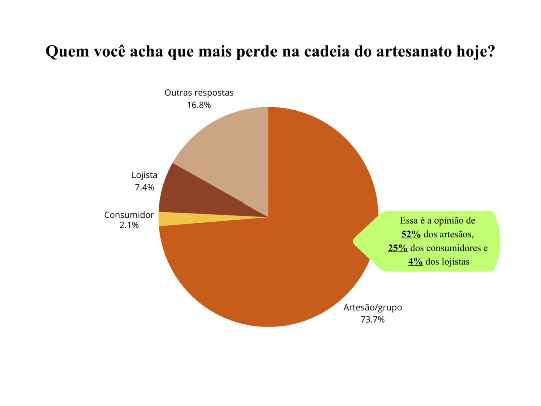 Para 74% dos respondentes, quem mais perde no modelo atual são os artesãos ou grupos produtores. Entre aqueles que sustentam essa resposta, 52% são artesãos, 25% consumidores e 4% lojistas. Já entre os 7% dos respondentes que afirmam que quem mais perde na cadeia são os lojistas, 86% pertencem à categoria, não havendo nenhuma resposta de consumidores ou artesãos nessa opção. A percepção de ganho e perda pode estar fortemente relacionada ao lugar que cada ator ocupa na cadeia.