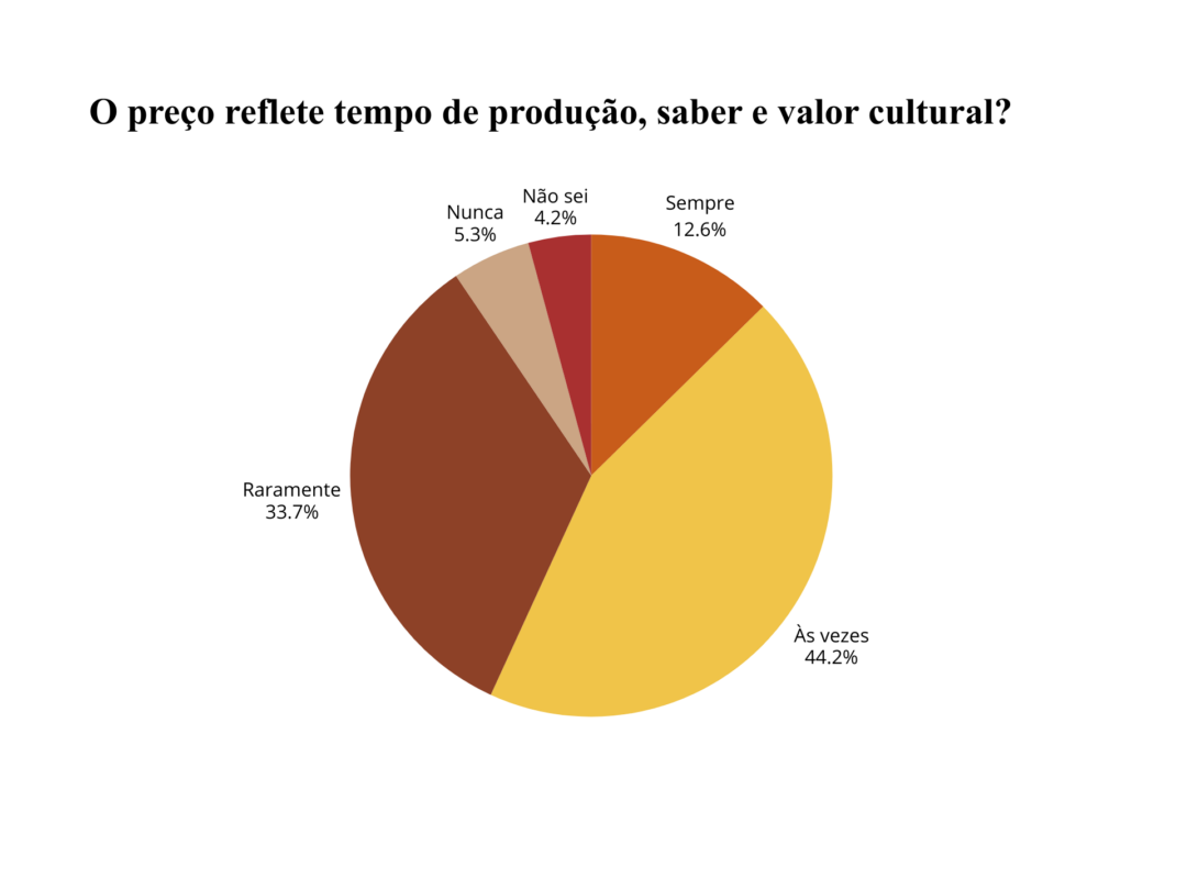 Entre os respondentes, 78% afirmam que o tempo de produção, o saber envolvido e o valor cultural do artesanato estão refletidos no preço apenas às vezes ou raramente, indicando que a adequação entre preço e valor é percebida como exceção. Apenas 13% avaliam que isso ocorre sempre. O dado evidencia um descompasso entre reconhecimento simbólico, viabilidade econômica e preço final ao consumidor.