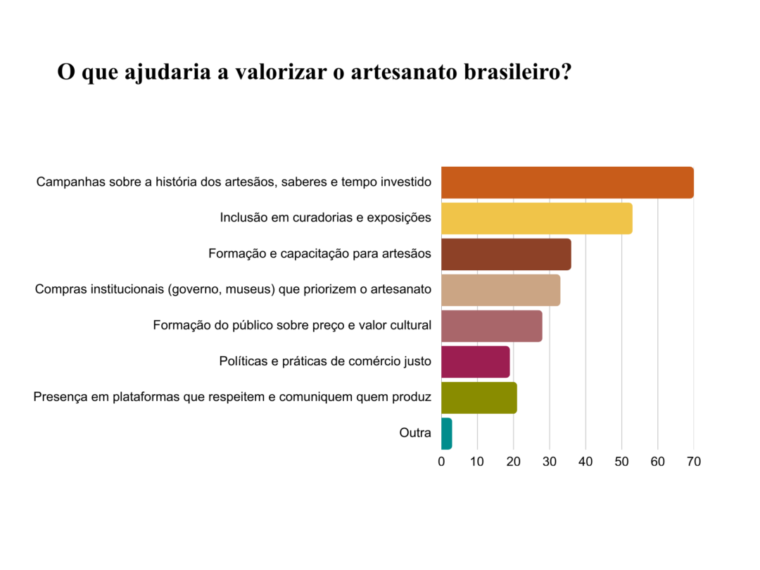 Quando questionados sobre caminhos possíveis para a valorização do artesanato, os respondentes apontaram soluções que combinam visibilidade, legitimação institucional e acesso a mercados estruturados. A recorrência de propostas ligadas a curadorias, exposições, campanhas narrativas e compras institucionais sugere que a valorização do artesanato passa por sua inserção qualificada em circuitos culturais e econômicos capazes de produzir reconhecimento simbólico e sustentabilidade financeira.
