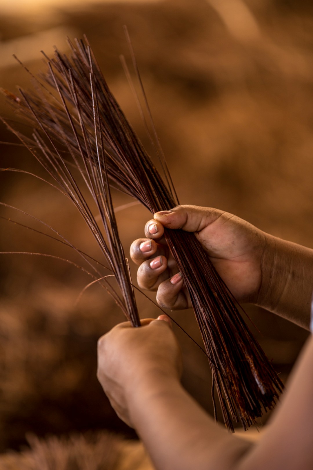 Com a fibra de piaçaba, cipó-titica, cipó-uambé, arumã, sementes naturais e madeira, o núcleo que reúne indígenas das etnias Baré, Baniwa, Tariano, Tukano e Tuyuca produz seu artesanato com as técnicas tradicionais do trançado e do entalhe. A diversidade de produtos encanta, reunindo desde biojoias e cestaria até peças decorativas e utilitárias, como bancos, barcos em miniatura, abanos, bolsas, entre outros. A maior parte da matéria-prima é extraída no rio Negro e em seus afluentes Padauiri e Aracá. O manejo é realizado com base nos conhecimentos milenares indígenas, que ensinam a trabalhar de forma sustentável. A extração é apenas o primeiro passo do longo processo de preparação da fibra usada nos trançados. No caso da fibra de piaçaba, ela é lavada até ficar bem limpa, enquanto o cipó-titica é queimado no fogo e depois descascado. Após essa preparação, são separadas as fibras que serão utilizadas na confecção de cestarias e as que darão forma às biojoias.