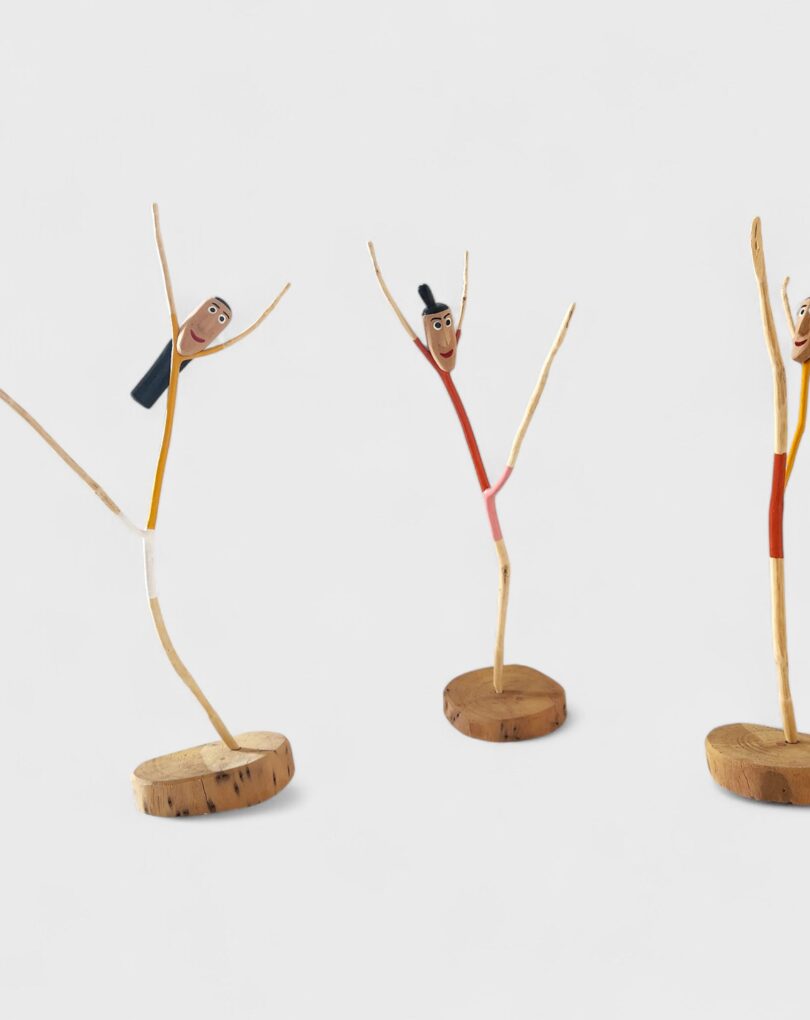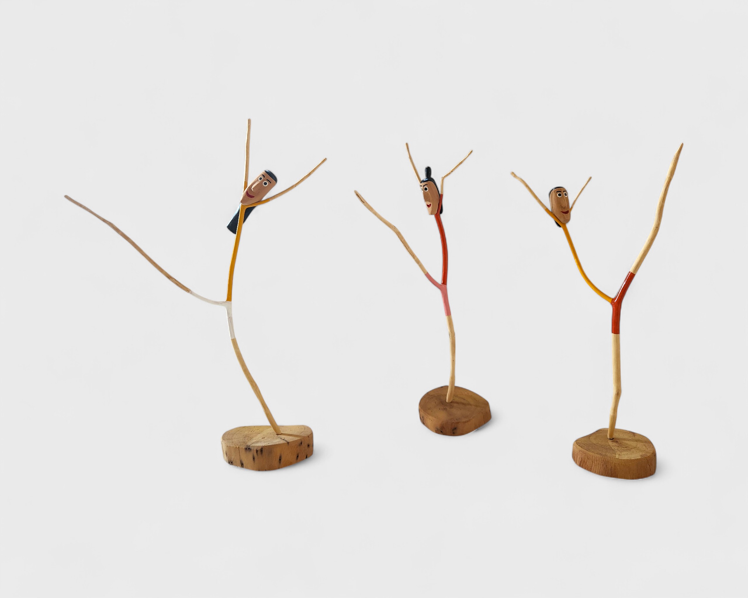 Atenção: produto com variações, após a compra entraremos em contato via WhatsApp para confirmar sua escolha. Esculturas de ginastas em madeira, que exploram a forma natural dos galhos para compor corpos em movimento. As figuras, entalhadas e pintadas à mão, preservam a textura e a curvatura do material, transformando simplicidade em expressão. [Cód. 3293]