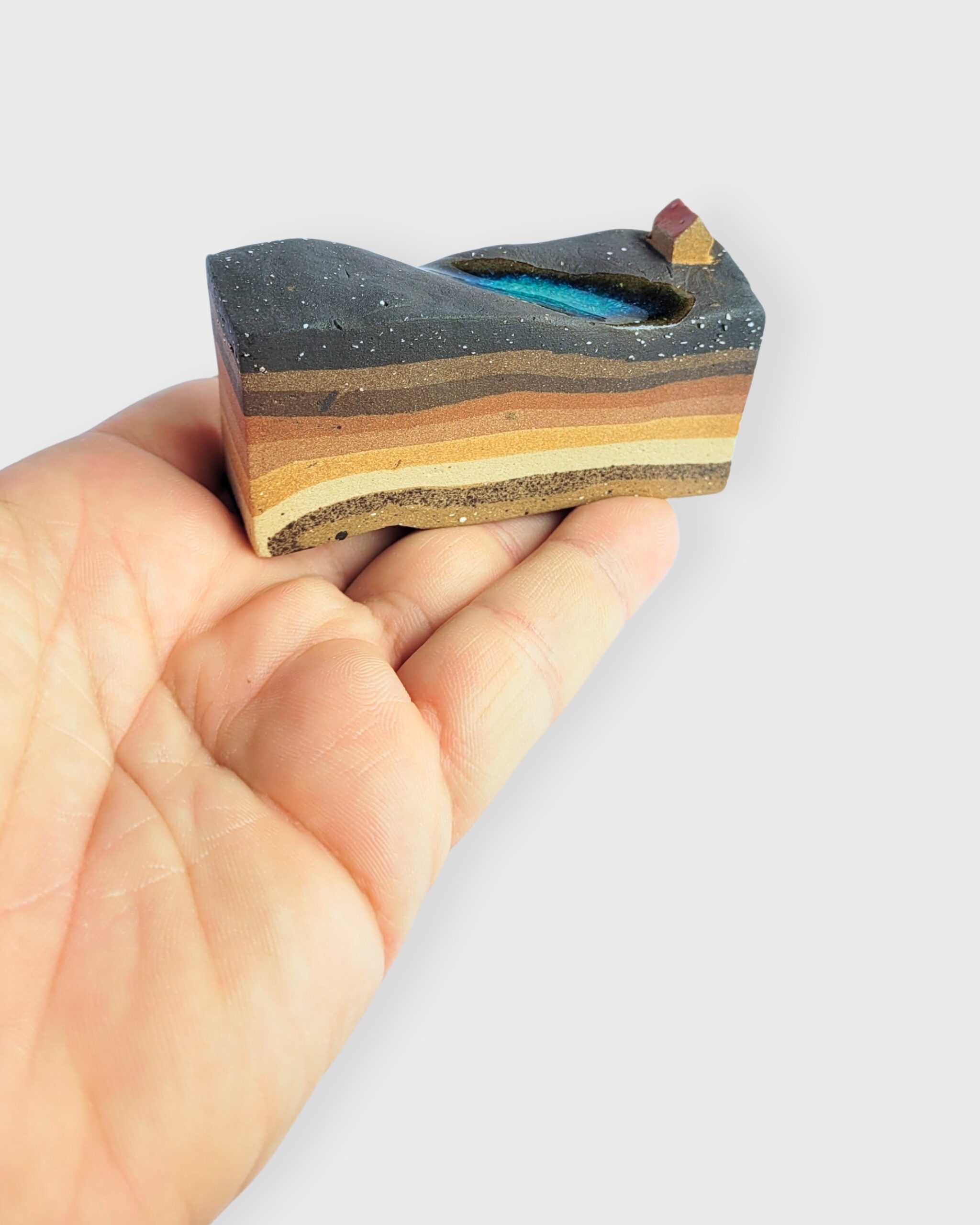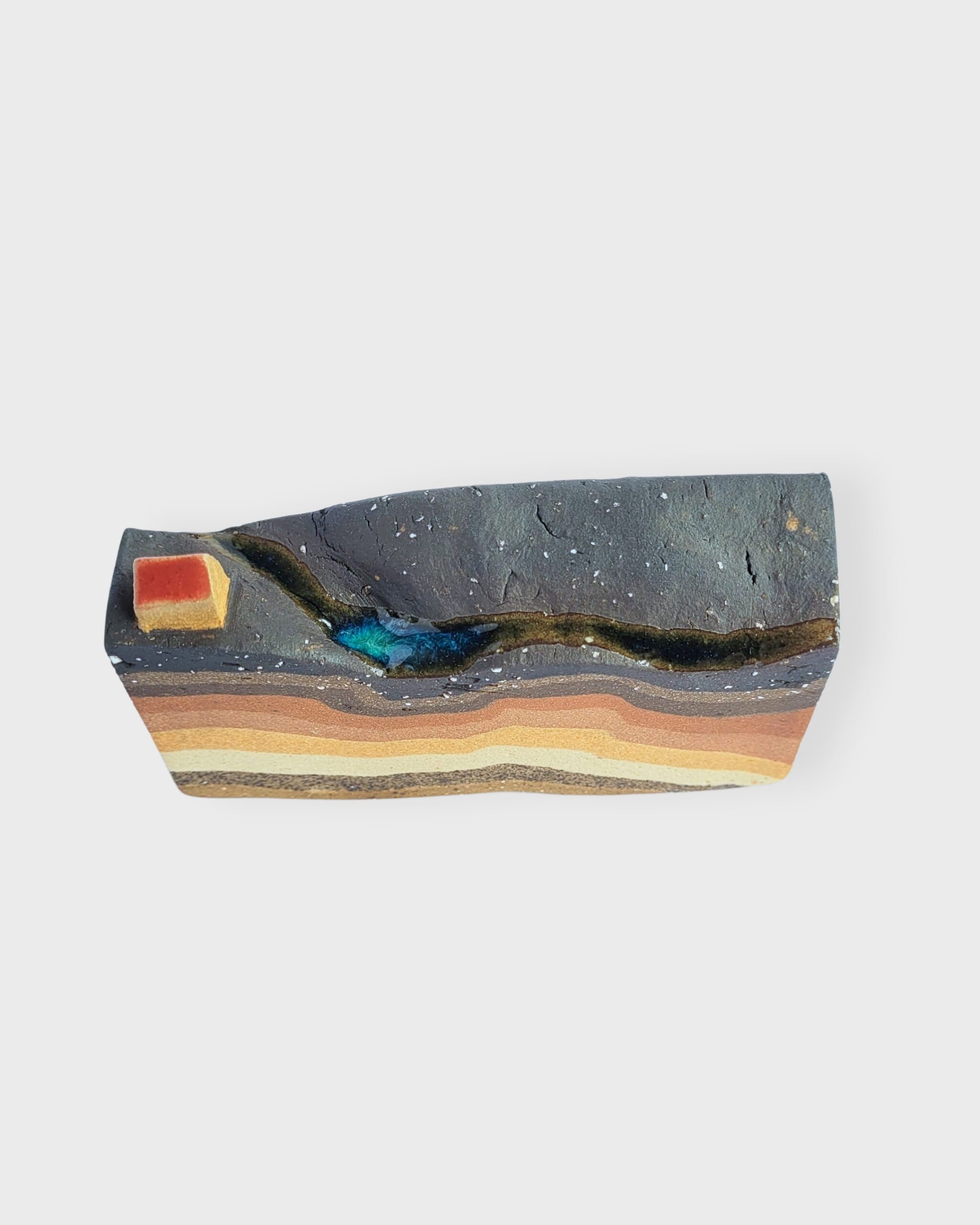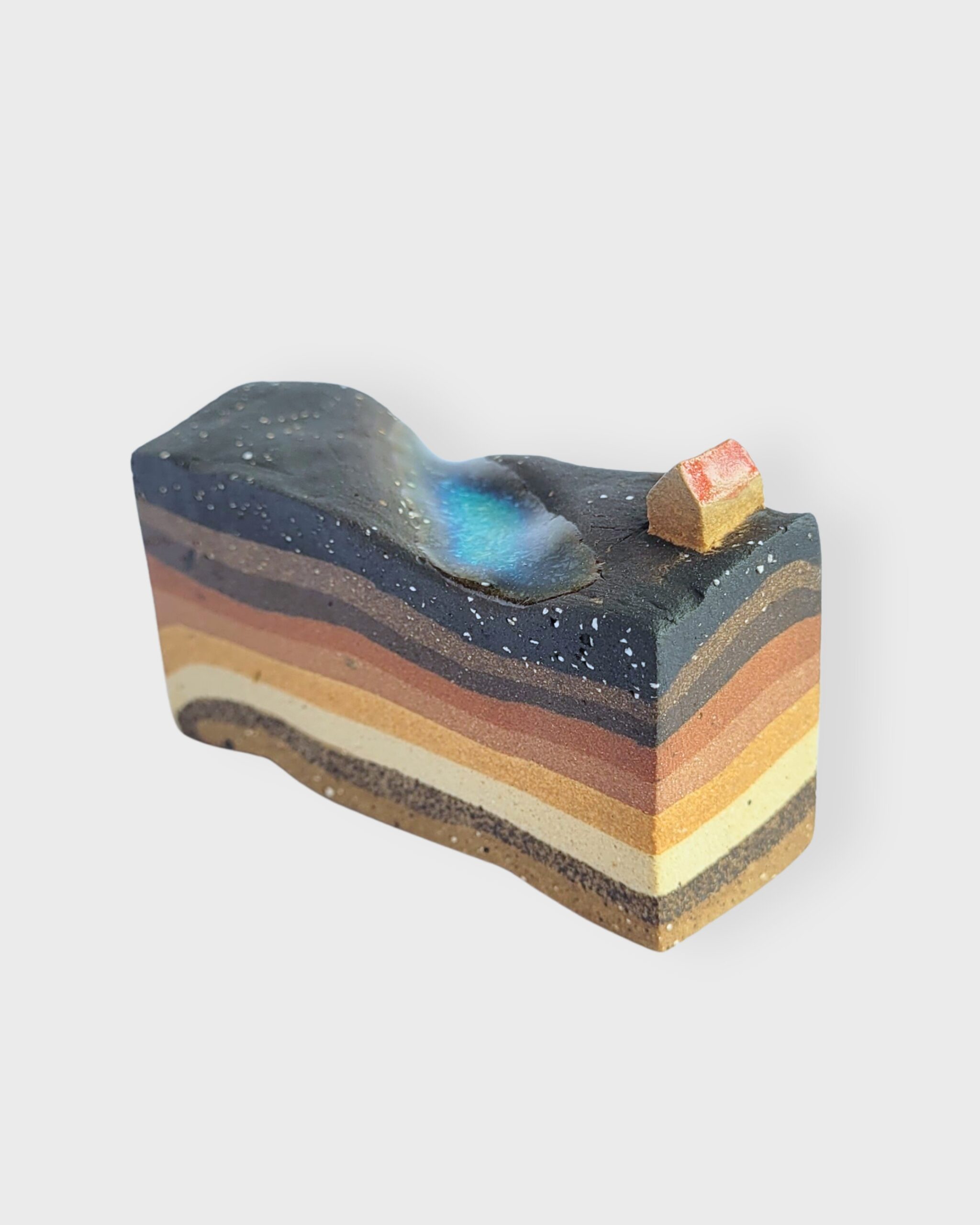 Peça em cerâmica esmaltada feita à mão por Will Comin. A peça é construída em placas de argila sobrepostas, criando camadas visíveis que remetem a cortes do solo. Objeto decorativo de pequeno formato, cada peça é única, resultado de processos artesanais de modelagem e dupla queima em alta temperatura. [Cód. 3319]