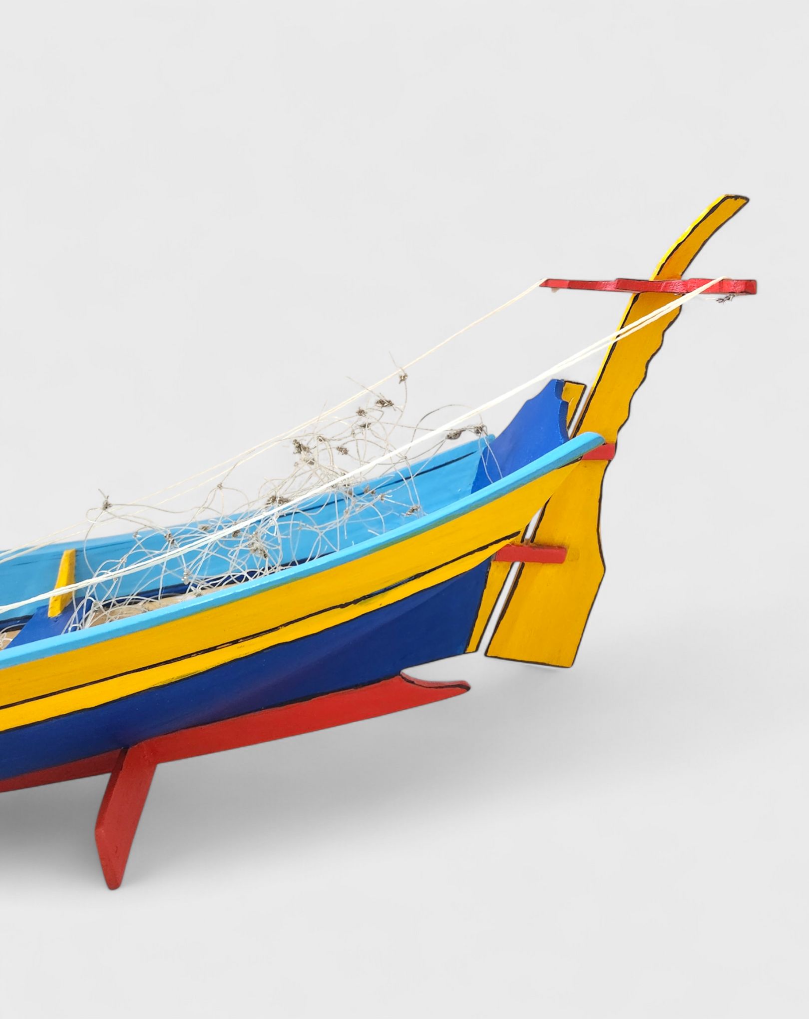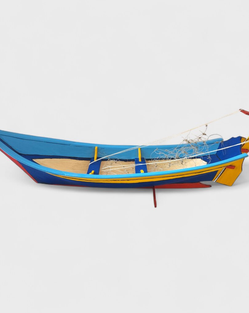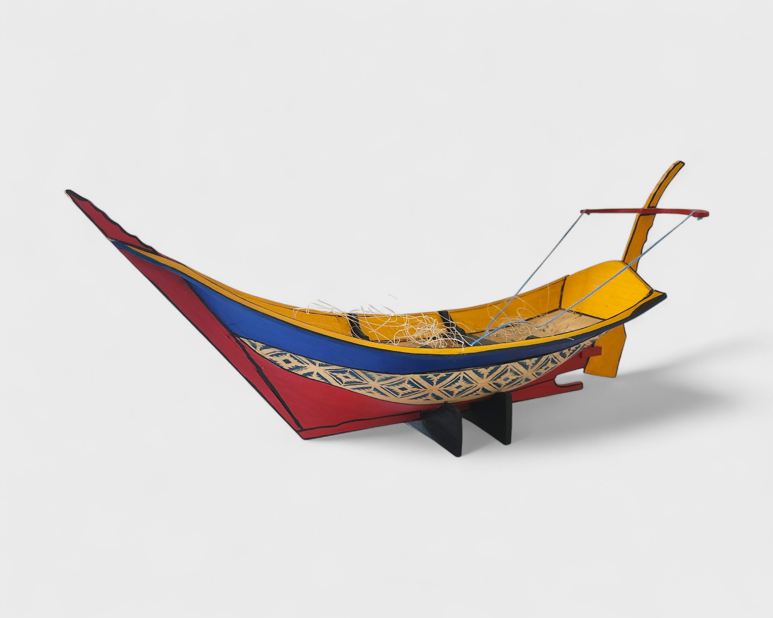 Miniaturas de embarcações em madeira revelam o olhar apurado de Edina sobre o ofício da marcenaria tradicional. Suas canoas e barcos, talhados com precisão e pintados à mão, exploram o contraste entre linhas estruturais e superfícies coloridas. O desenho limpo e o rigor nos encaixes evidenciam um trabalho que alia técnica e experimentação estética.