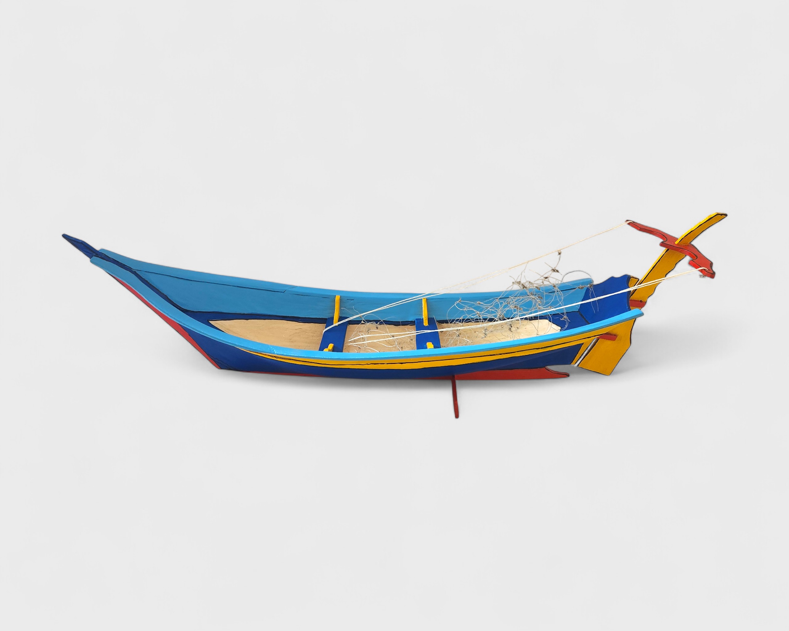 Miniaturas de embarcações em madeira revelam o olhar apurado de Edina sobre o ofício da marcenaria tradicional. Suas canoas e barcos, talhados com precisão e pintados à mão, exploram o contraste entre linhas estruturais e superfícies coloridas. O desenho limpo e o rigor nos encaixes evidenciam um trabalho que alia técnica e experimentação estética. [Cód. 3286]