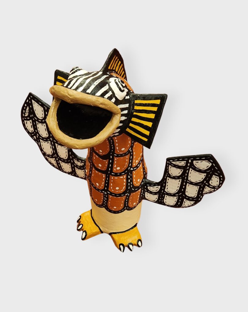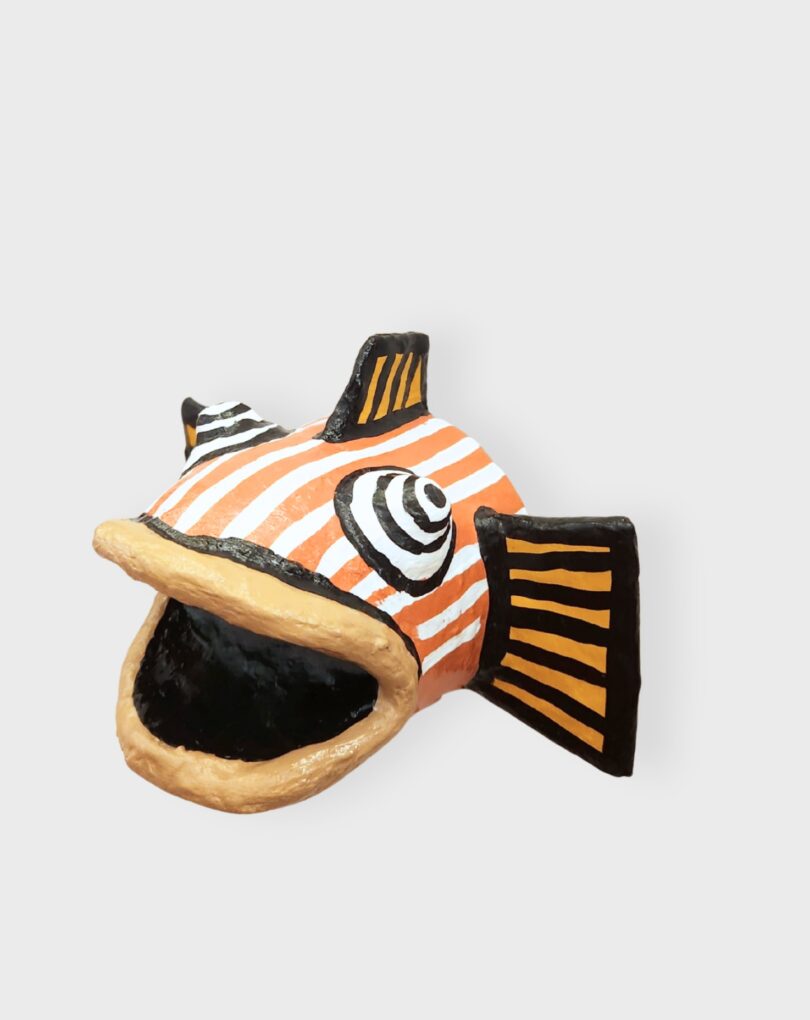 Atenção: produto com variações, após a compra entraremos em contato via WhatsApp para confirmar sua escolha. As peças de André Menezes são feitas com materiais reciclados, por meio da técnica que ele chama de reclipachê — uma mistura de reciclagem, papietagem e papel-machê. “Homens-peixes-caranguejos” e “peixes-pássaros” emergem como formas híbridas que dialogam com o tema da curadoria Correntezas Criativas, fazendo do reaproveitamento não apenas método, mas também metáfora para fluxo, adaptação e renovação. [Cód. 3312]