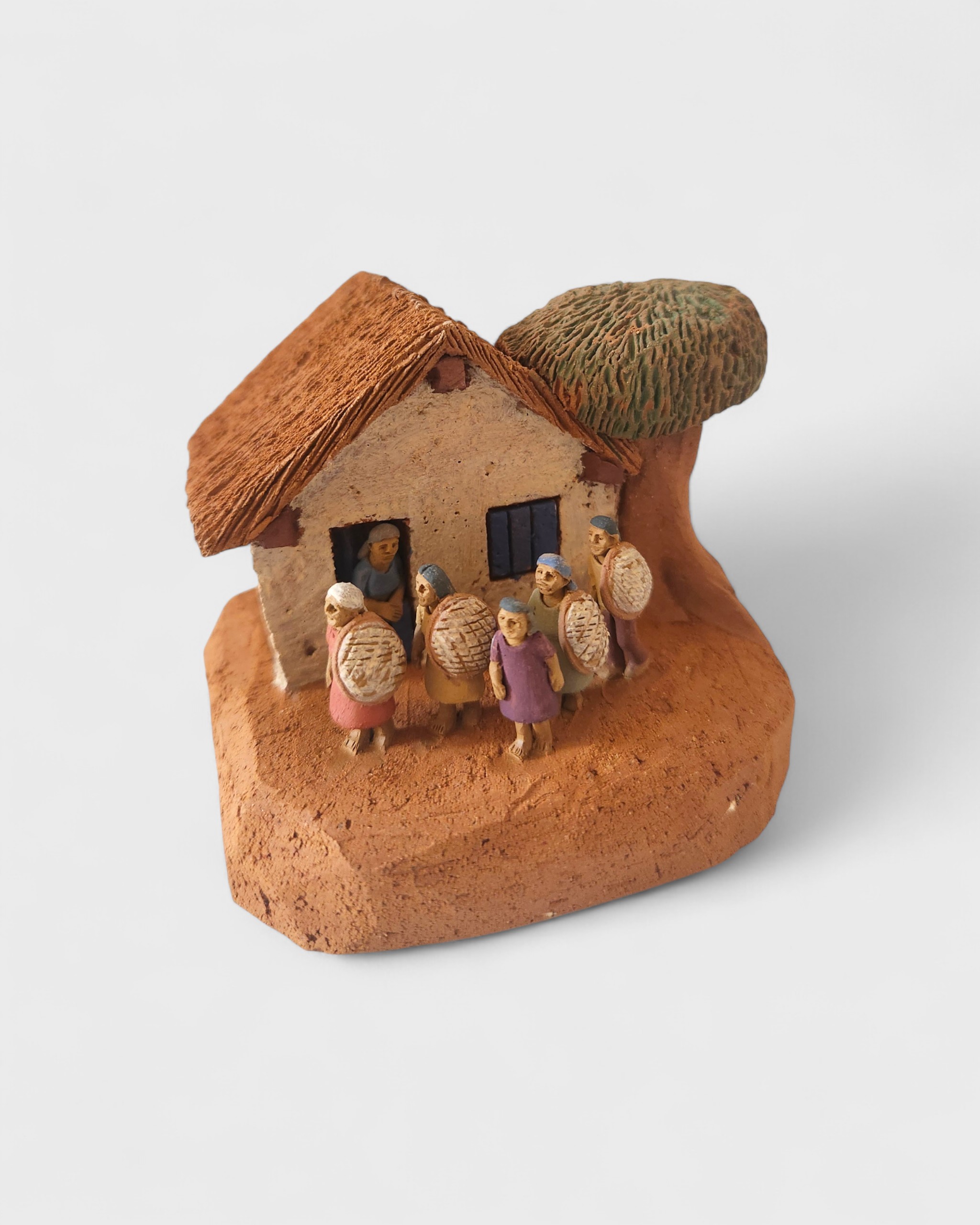 Miniaturas em cerâmica que retratam cenas de lavadeiras e pescadores, modeladas e pintadas à mão. As peças, moldadas em argila, revelam minúcia nos gestos, expressões e texturas: telhados, cestos e tecidos ganham volume e detalhe em escala reduzida. [Cód. 3270]