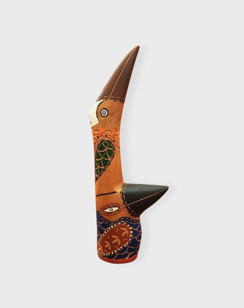 Escultura em madeira que combina entalhe preciso e pintura detalhada para representar animais como pássaros e lagartos e criaturas fantásticas. O artesão Sérgio Teófilo dá nova vida a raízes e galhos encontrados, valorizando as irregularidades da matéria, aproveitando suas formas naturais. [Cód. 3244]