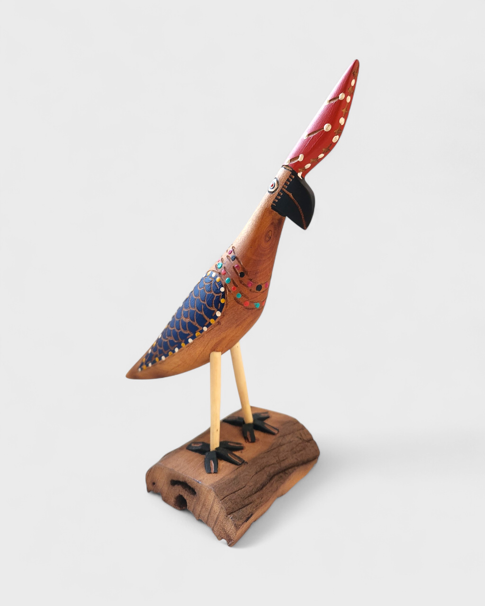 Esculturas em madeira que combinam um entalhe preciso e pintura detalhada para representar animais como pássaros e lagartos. A partir de raízes e galhos encontrados, o artesão molda criaturas fantásticas, valorizando as irregularidades da matéria, aproveitando suas formas naturais.