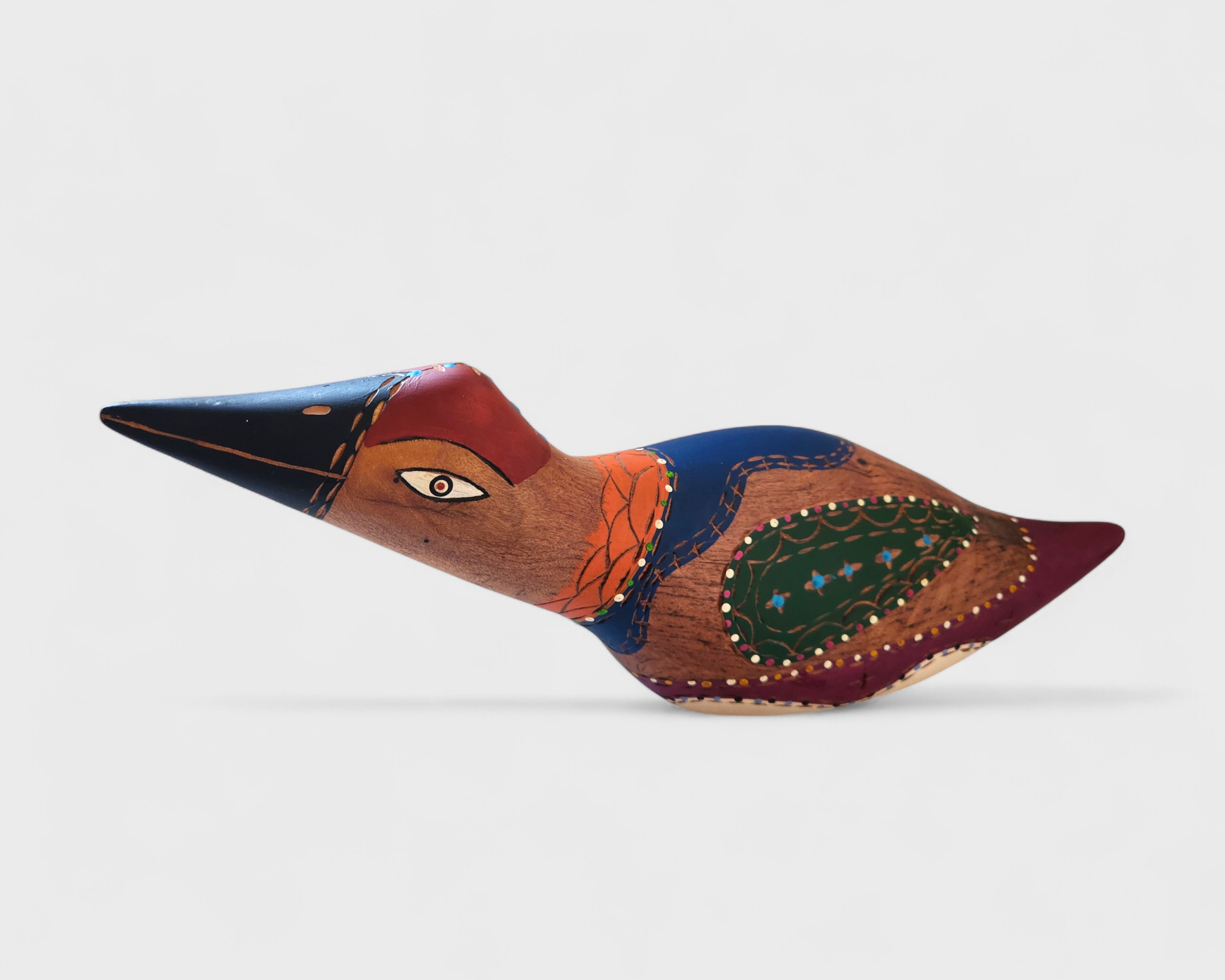 Esculturas em madeira que combinam um entalhe preciso e pintura detalhada para representar animais como pássaros e lagartos. A partir de raízes e galhos encontrados, o artesão molda criaturas fantásticas, valorizando as irregularidades da matéria, aproveitando suas formas naturais.