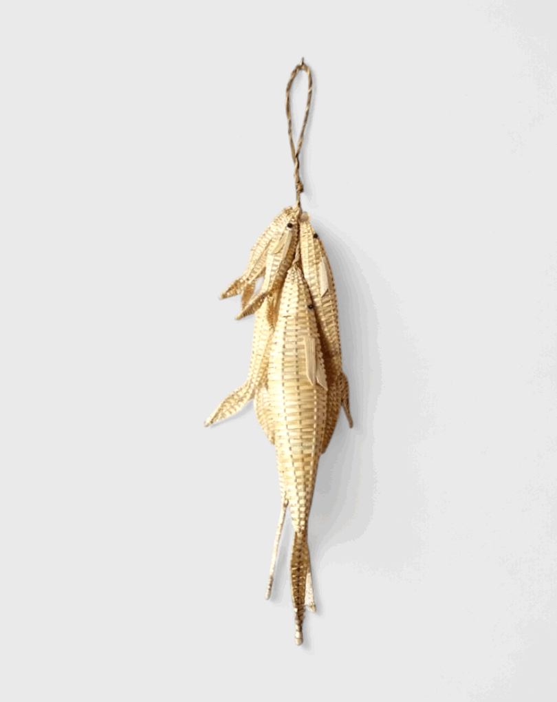 Pencas de peixes feitas em fibras naturais, trançadas e moldadas manualmente. Cada peixe é elaborado com tiras finas que reproduzem o formato e a textura do animal, unidas em cordão para composição suspensa. A peça valoriza a técnica do trançado tradicional e o valor das águas na cultura caiçara. [Cód. 3278]