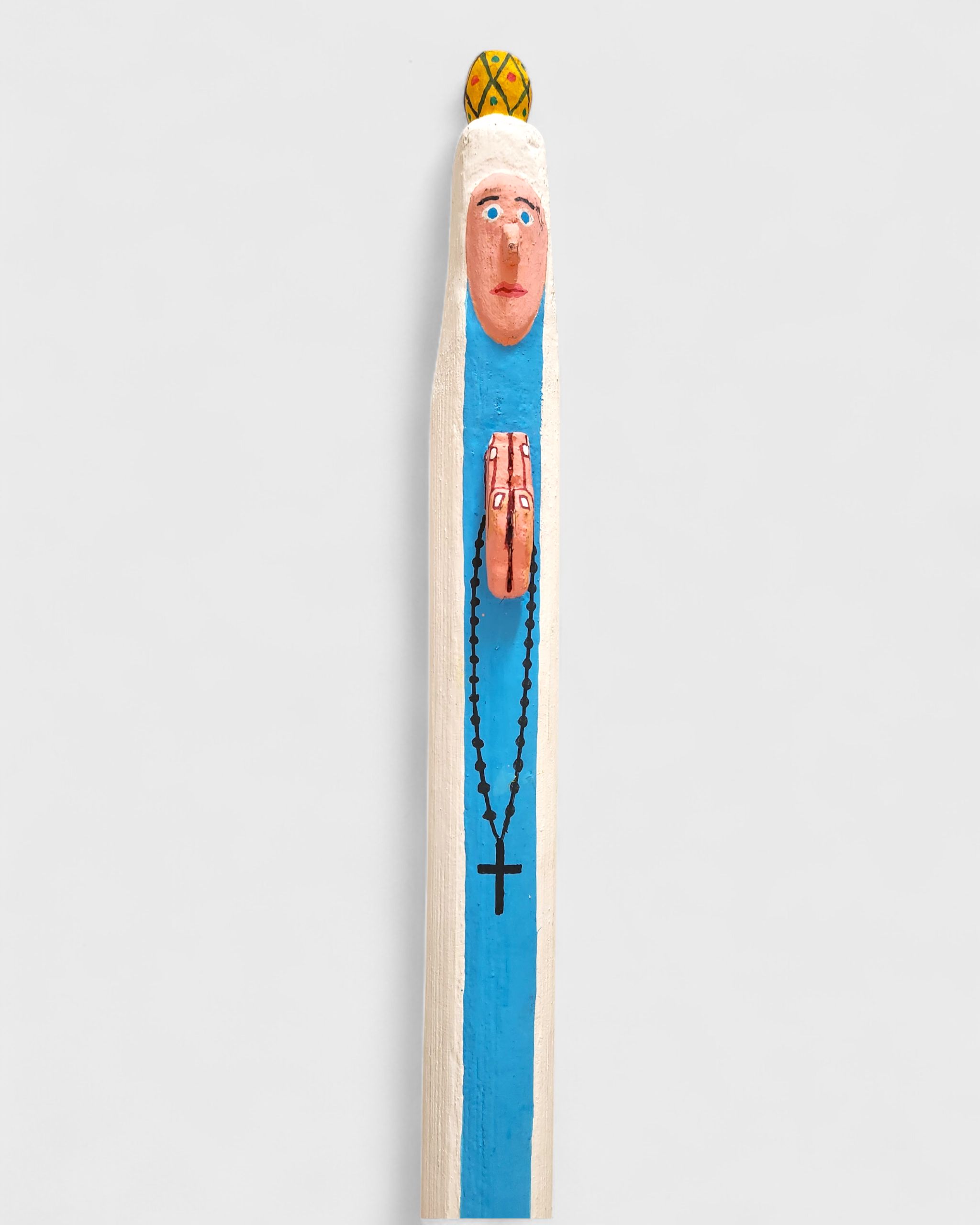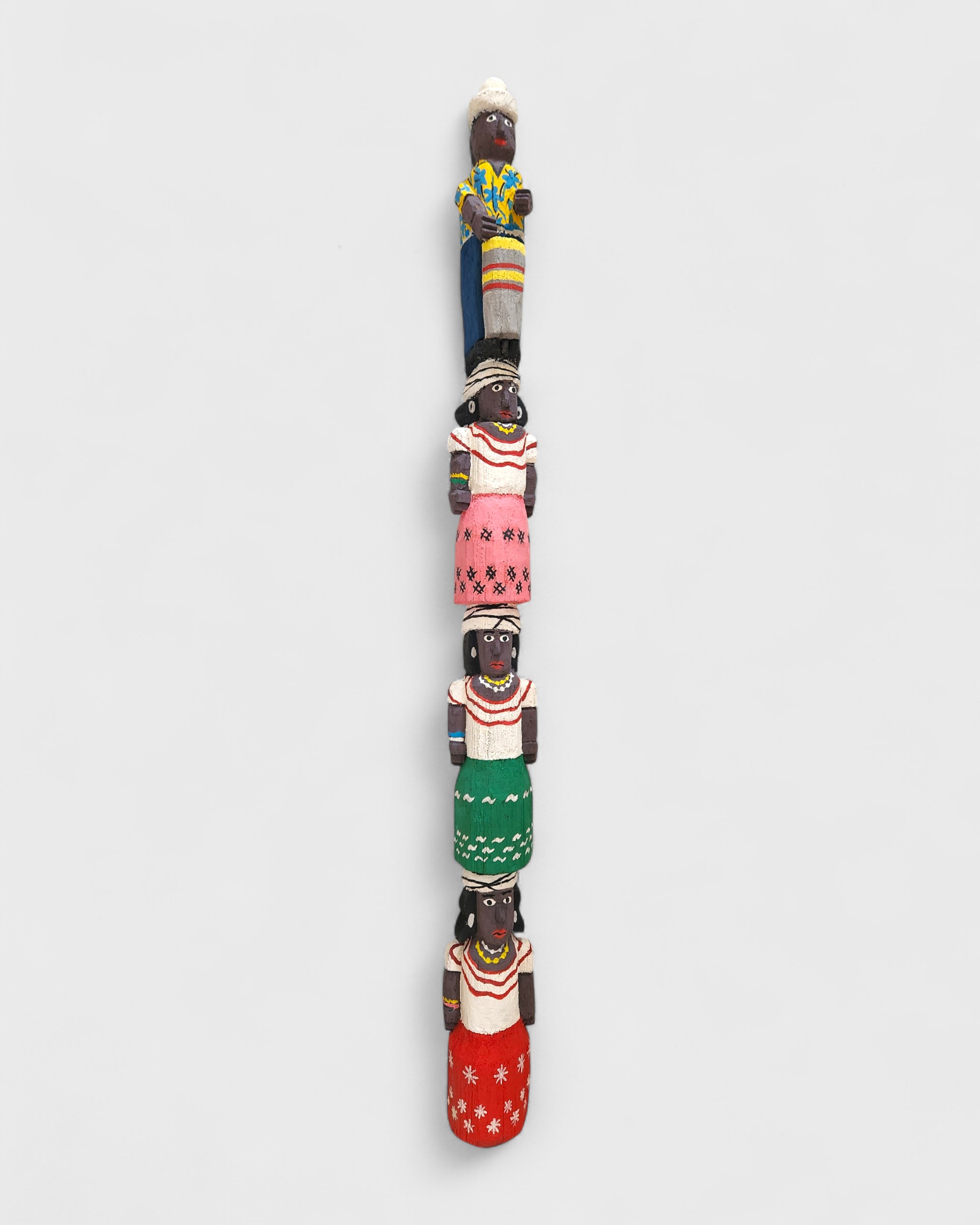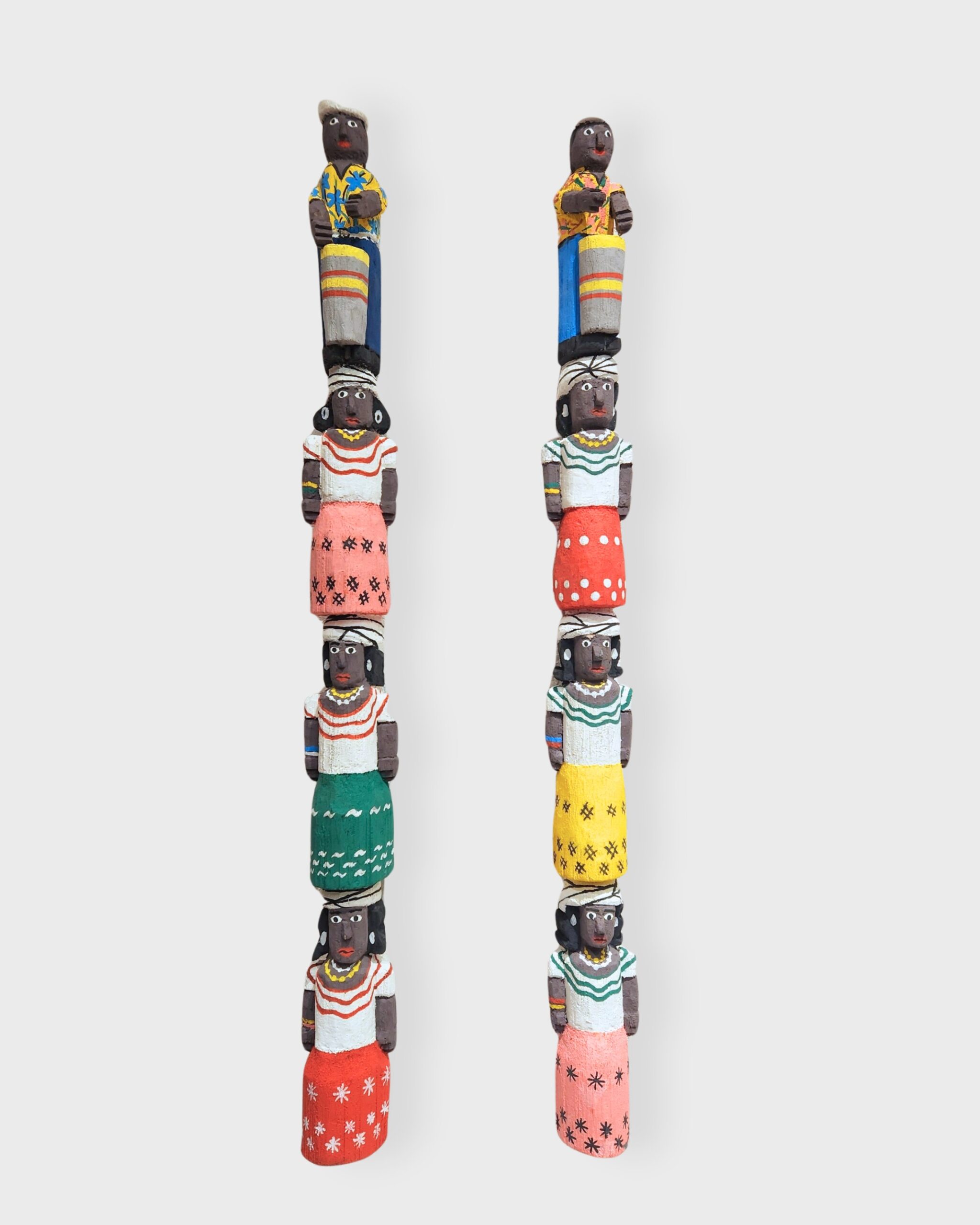 Totens em madeira que transformam troncos e galhos em figuras verticais de forte presença escultórica. Talhados à faca e pintados à mão, personagens como santos, cangaceiros e figuras afro-brasileiras, revelam domínio do entalhe, precisão nas proporções e uma paleta vibrante que realça o gesto e a identidade popular de sua arte. [Cód. 3240]