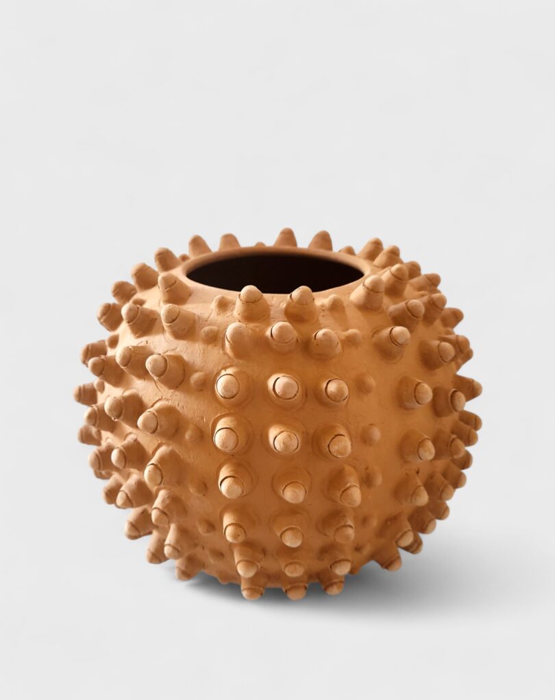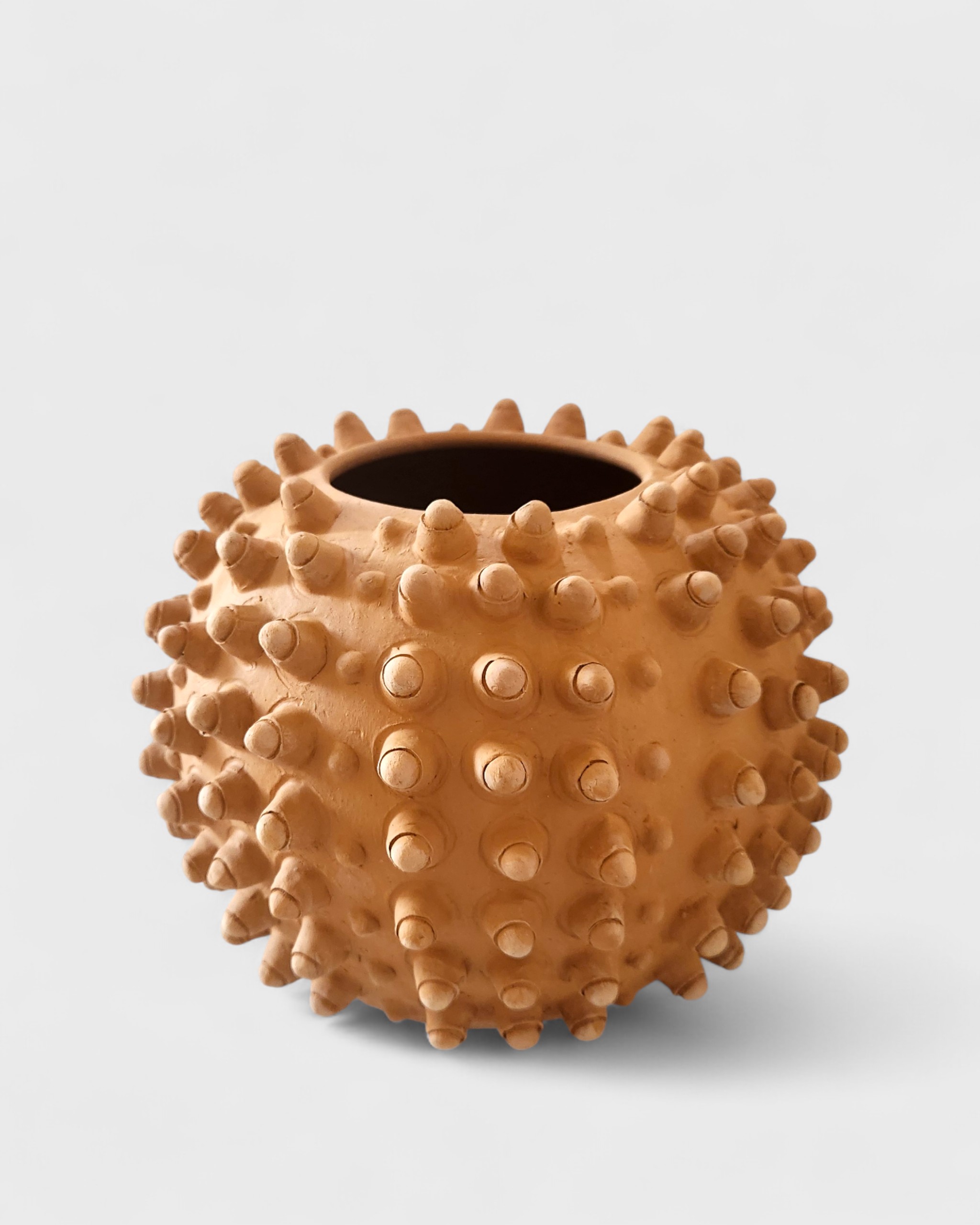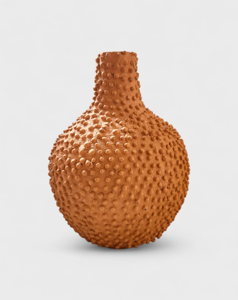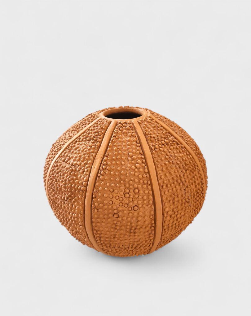 Escultura e vasos com superfícies texturizadas, obtidas por sobreposição e entalhe de pequenas formas, criam relevos precisos que valorizam a cor natural do barro. Cada peça evidencia o controle do gesto e a busca por ritmo e profundidade na matéria.
