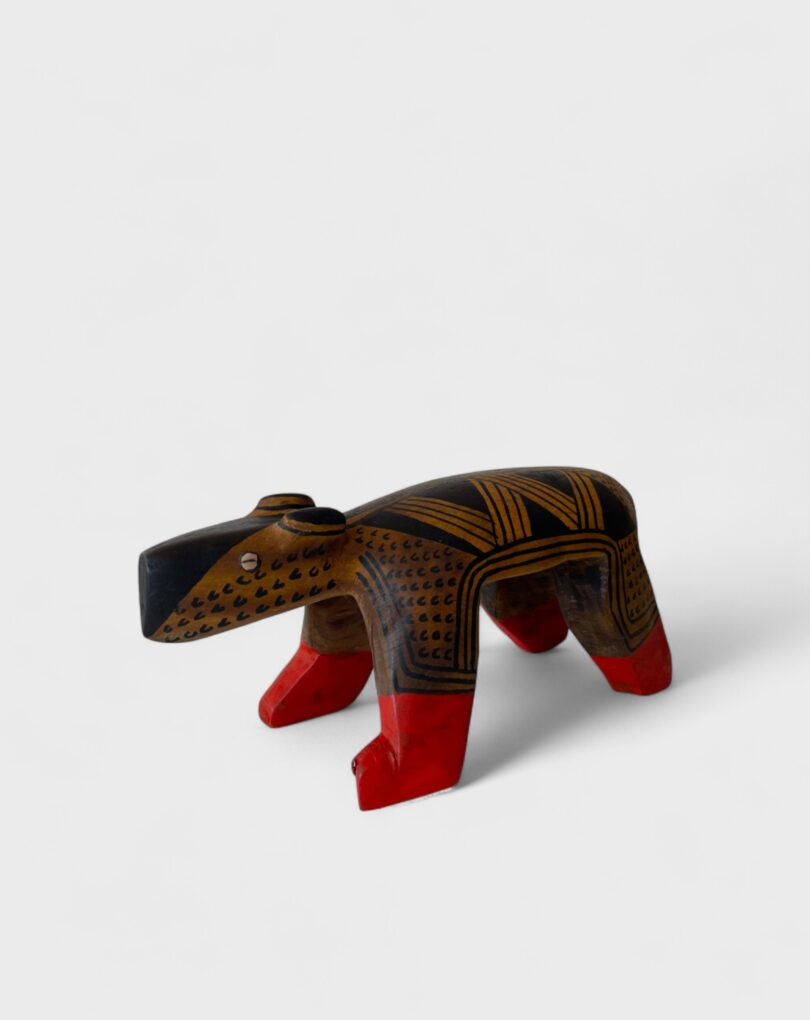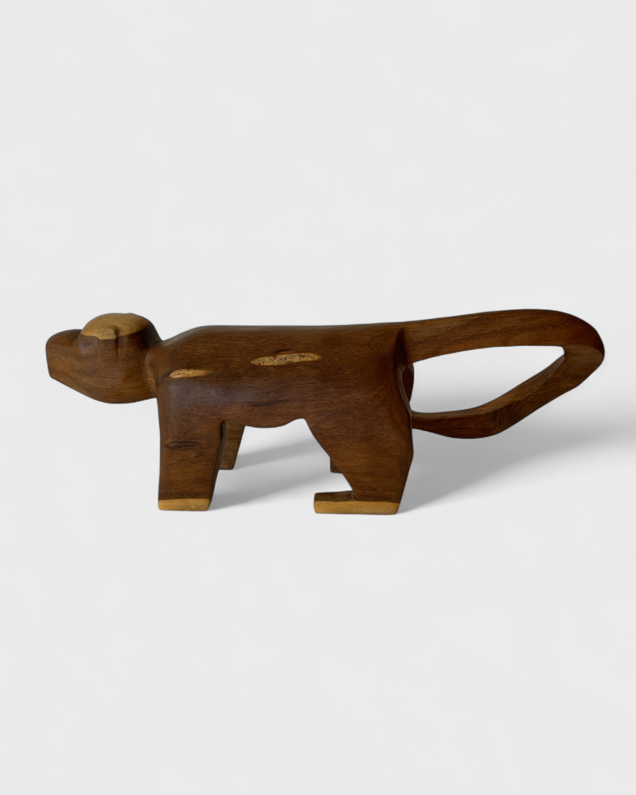 Banco esculpido por Peti Waurá, da etnia Waurá, do Alto Xingu (MT), talhado em tronco único de madeira. A peça representa um macaco e mantém a tradição dos bancos xinguanos, usados como objetos pessoais e cerimoniais. Sem grafismos, destaca o valor simbólico do entalhe e a elegância da forma limpa. Reconhecidos pelo design, os bancos do Xingu ganham destaque também como objetos contemporâneos de arte e coleção. [Cód. 3065]