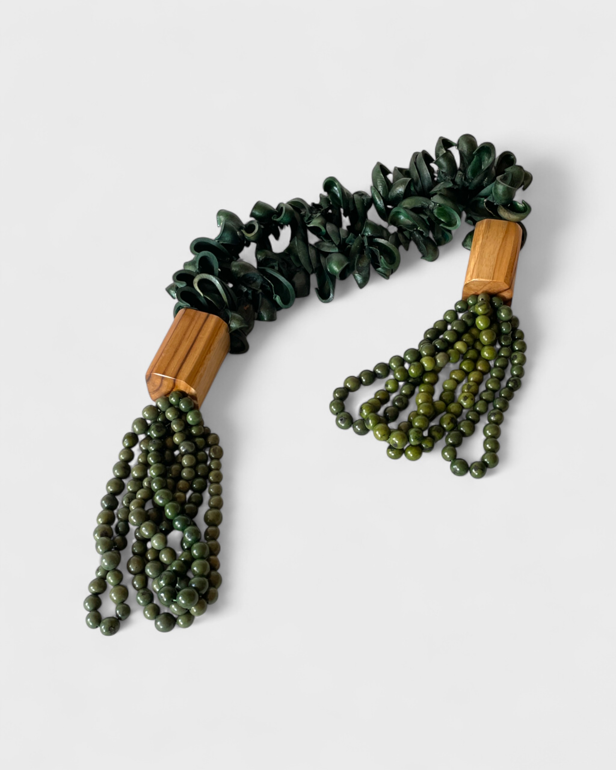 Colar para mesa criado pela Criare Biojoias, de Rio Branco (AC), com sementes verdes e madeiras reaproveitadas da floresta amazônica. A peça combina elementos naturais em composições orgânicas e harmônicas, destacando volumes, texturas e tons da terra.