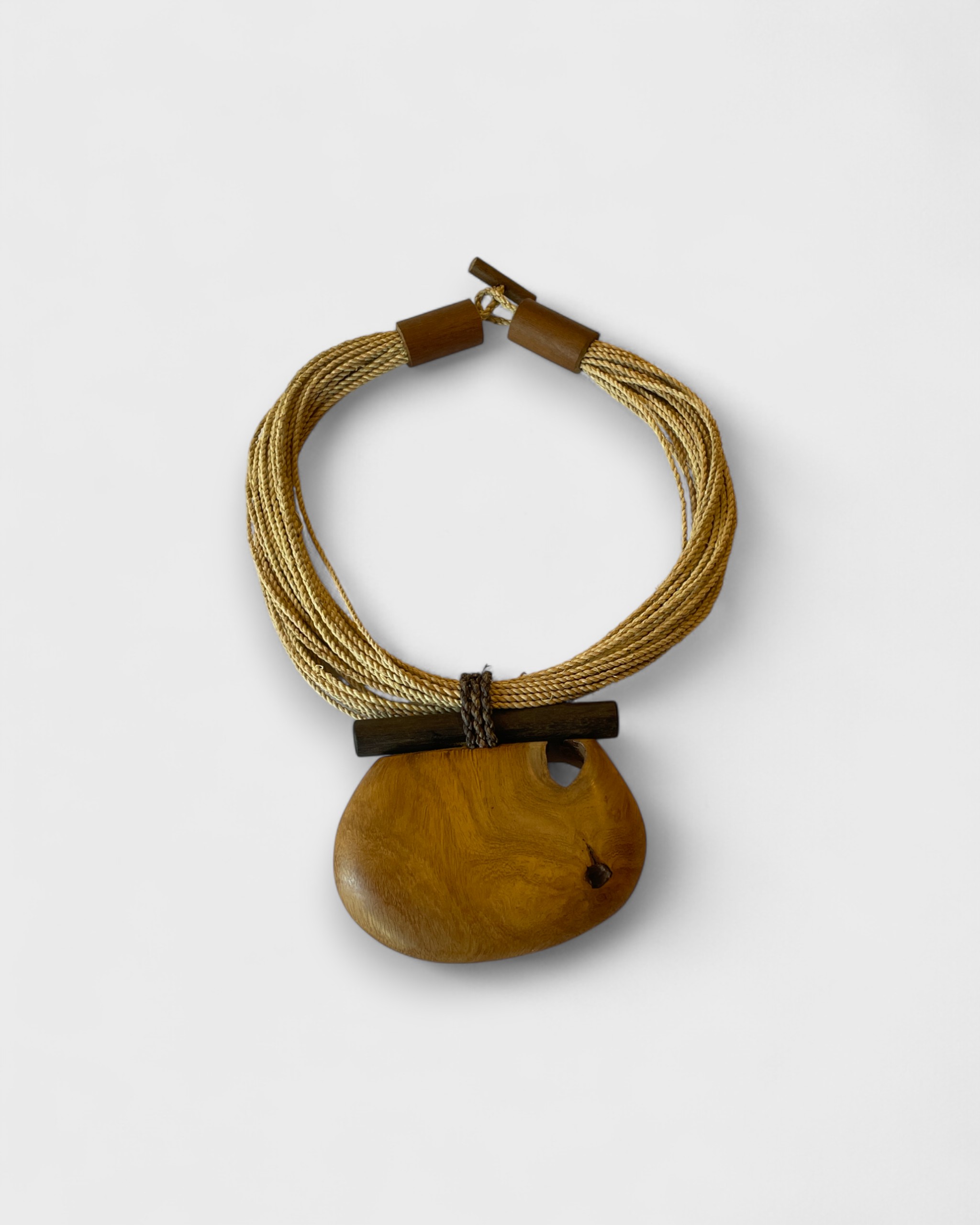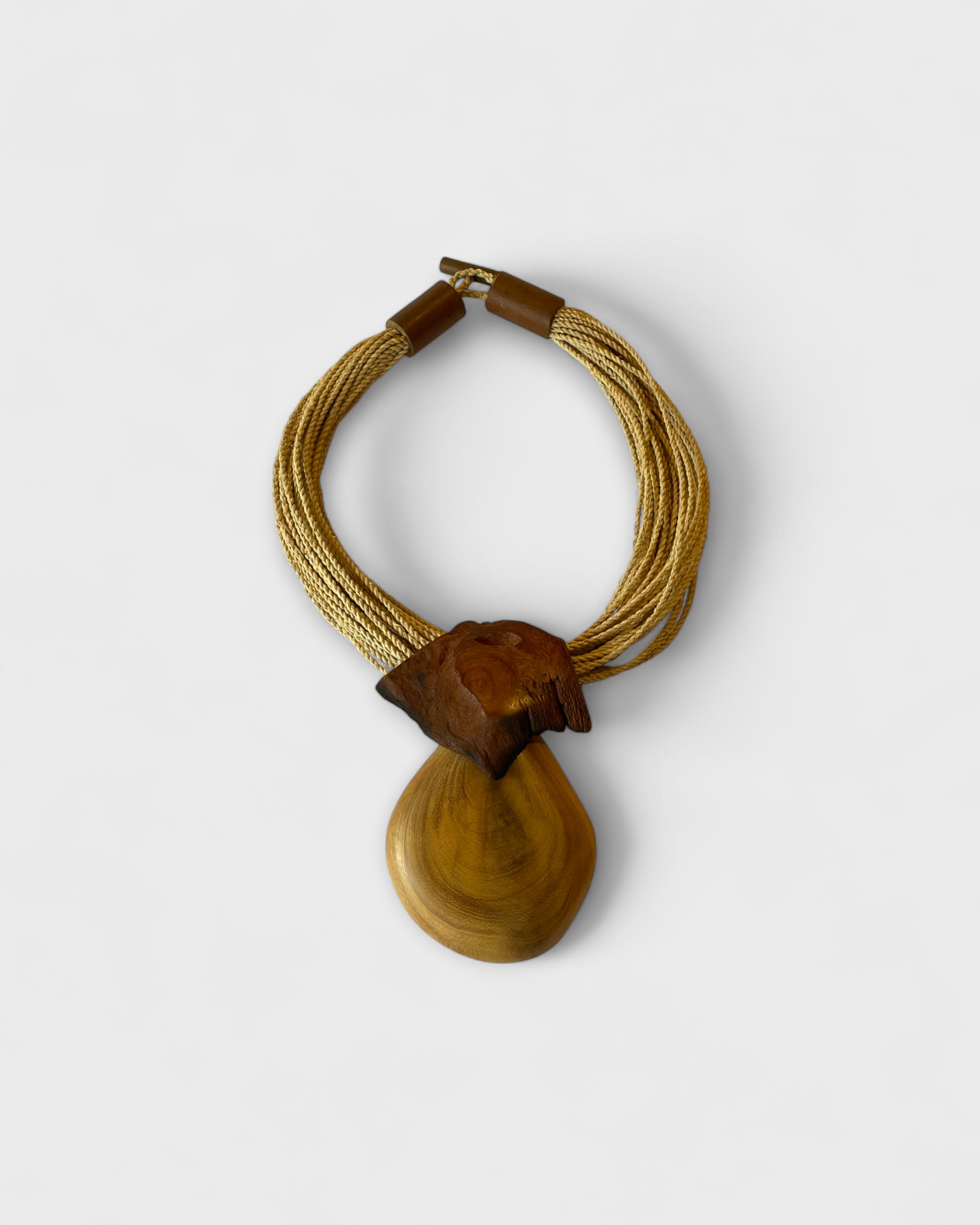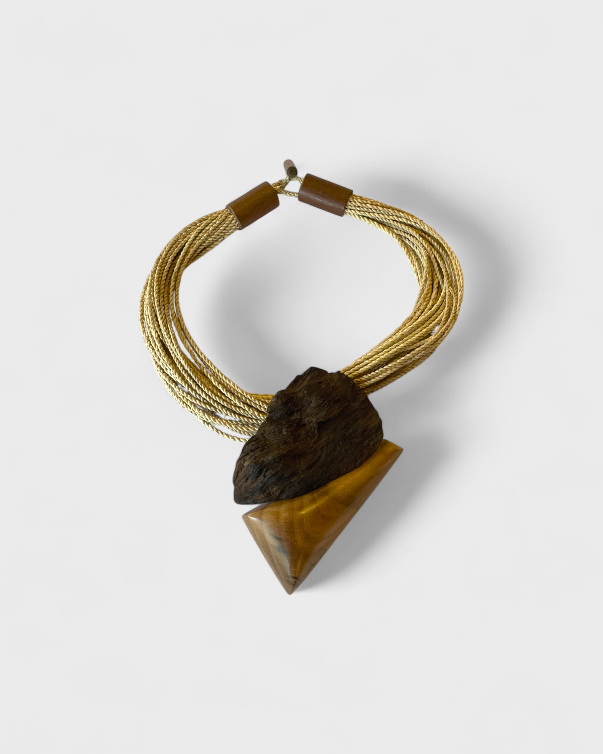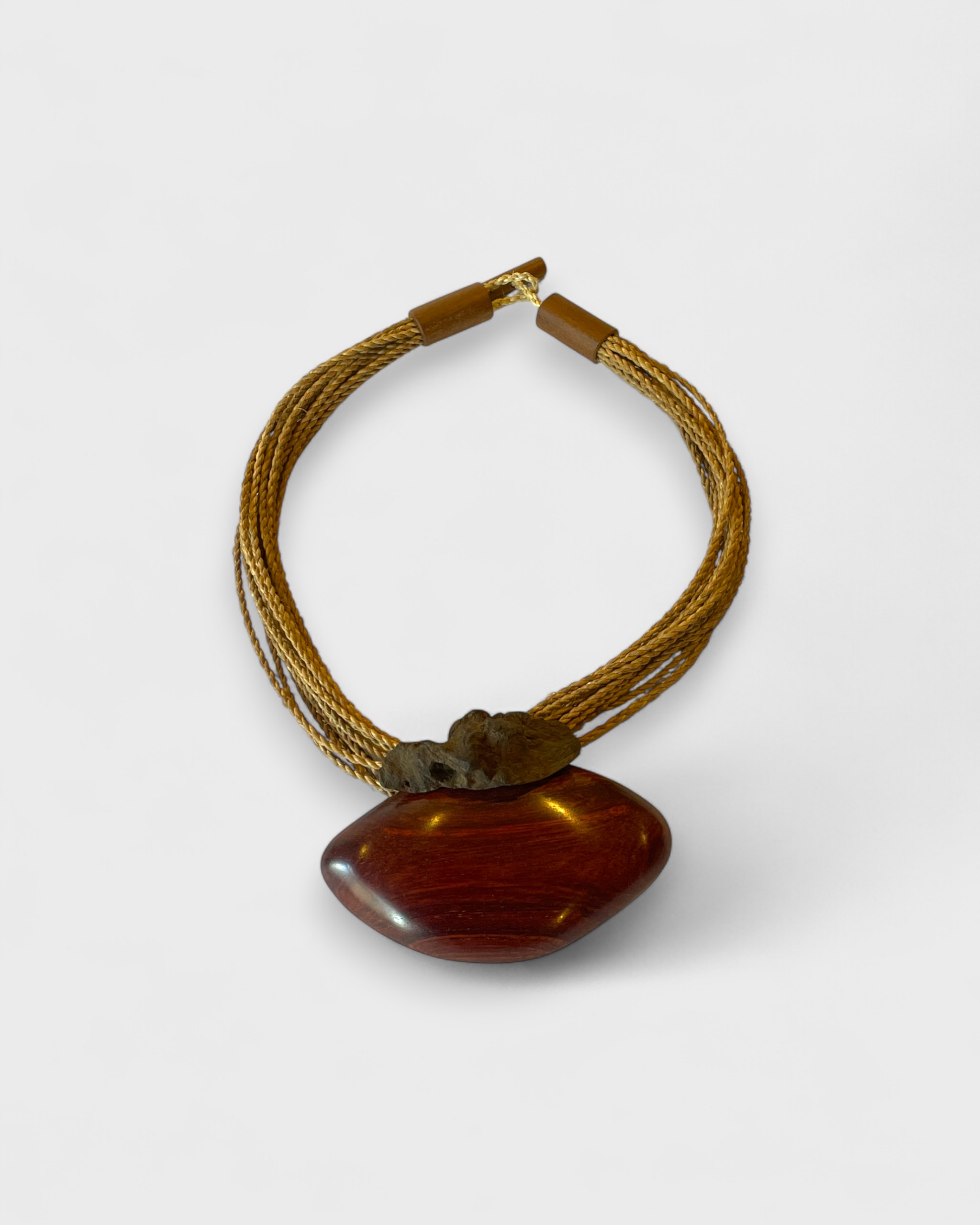 Colar em marchetaria feito pela Alê Marchê, de Novo Airão (AM), feito com madeiras amazônicas reaproveitadas e fios de tucum trançado. Cada pingente é esculpido à mão, unindo formas orgânicas e geométricas em composições únicas. Com acabamento em couro, é uma biojoia autoral que carrega técnica, sensibilidade e identidade amazônica. [Cód. 3033]