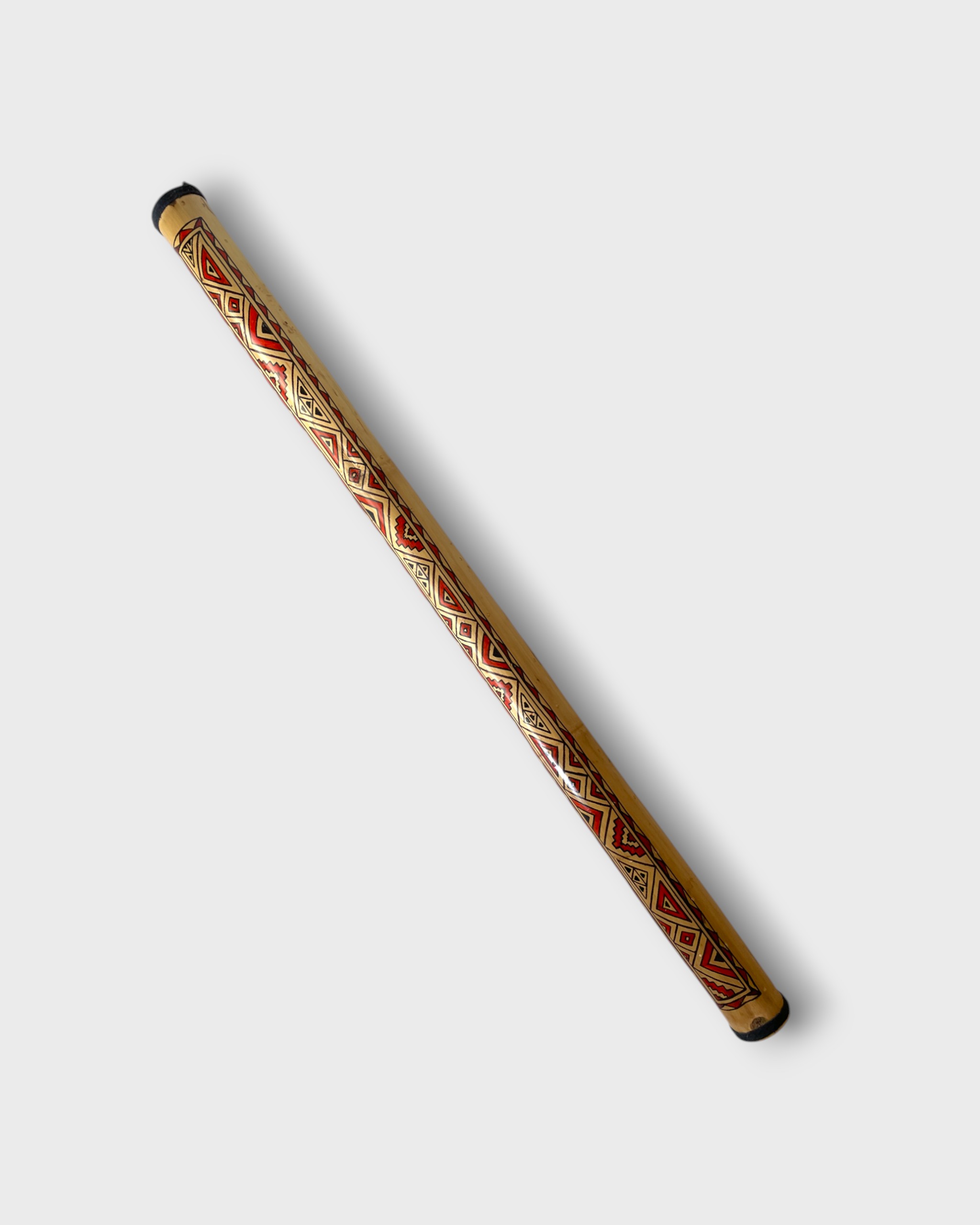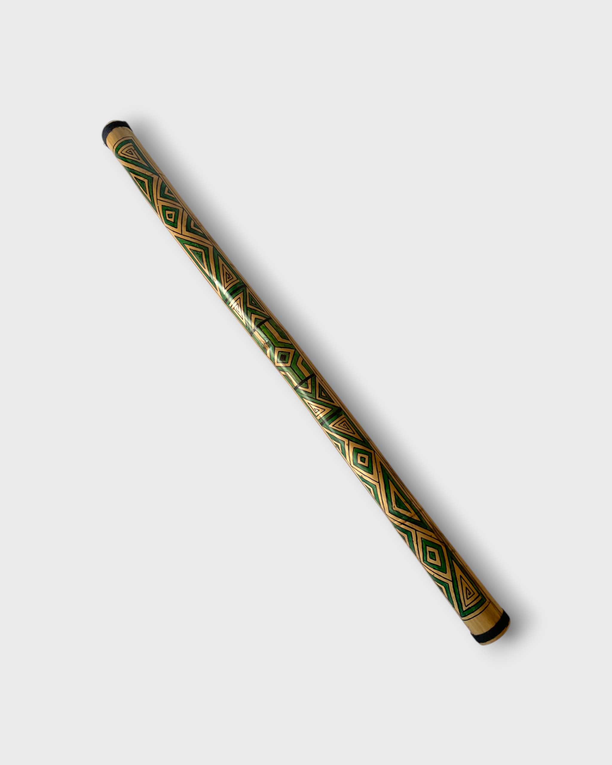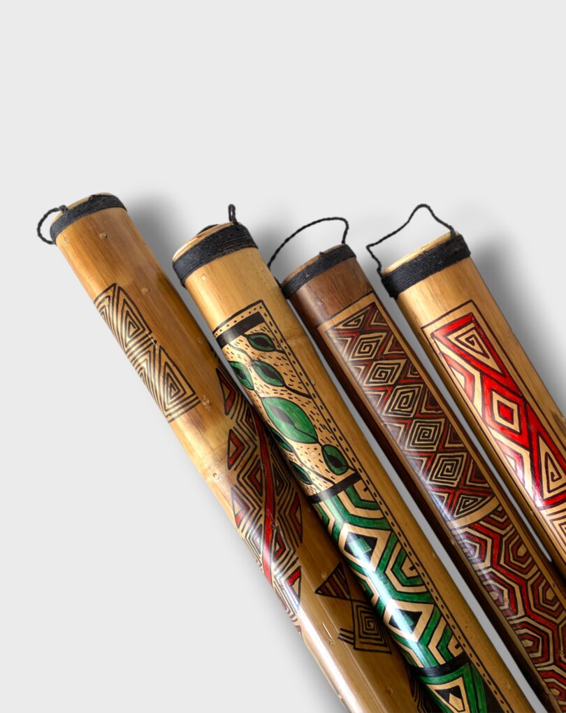 Pau de chuva criado por Alexandre Paulemy, de Oeiras (PA). Confeccionado em bambu, o instrumento é adornado com grafismos geométricos em vermelho e verde, que remetem à estética indígena e à conexão com a natureza. Ao ser manuseado, reproduz o som da chuva, evocando a musicalidade ancestral e a relação espiritual com a floresta. Une arte, tradição e sensibilidade sonora amazônica.