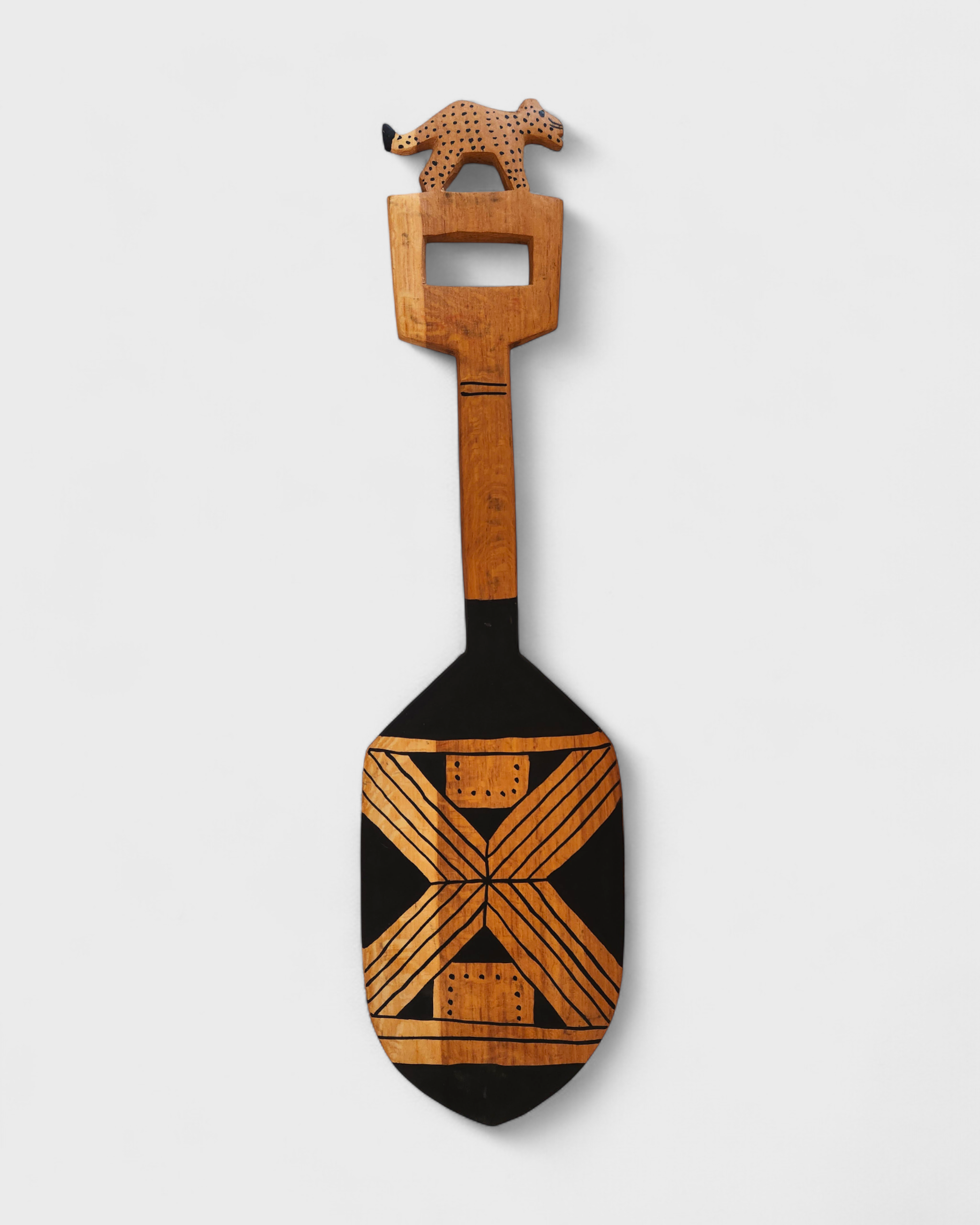 Remo esculpido em madeira pelos Mehinako, povo do Alto Xingu conhecido por sua rica tradição gráfica. Decorado com pintura de grafismos indígenas, cada traço expressa identidade, memória e espiritualidade. No cabo, o entalhe de um animal evoca a força e a presença dos seres da floresta, guardiões de poder e sabedoria. Mais que objeto, é uma obra que une utilidade, beleza e resistência cultural, traduzindo a conexão entre arte, natureza e ancestralidade. [Cód. 3210]