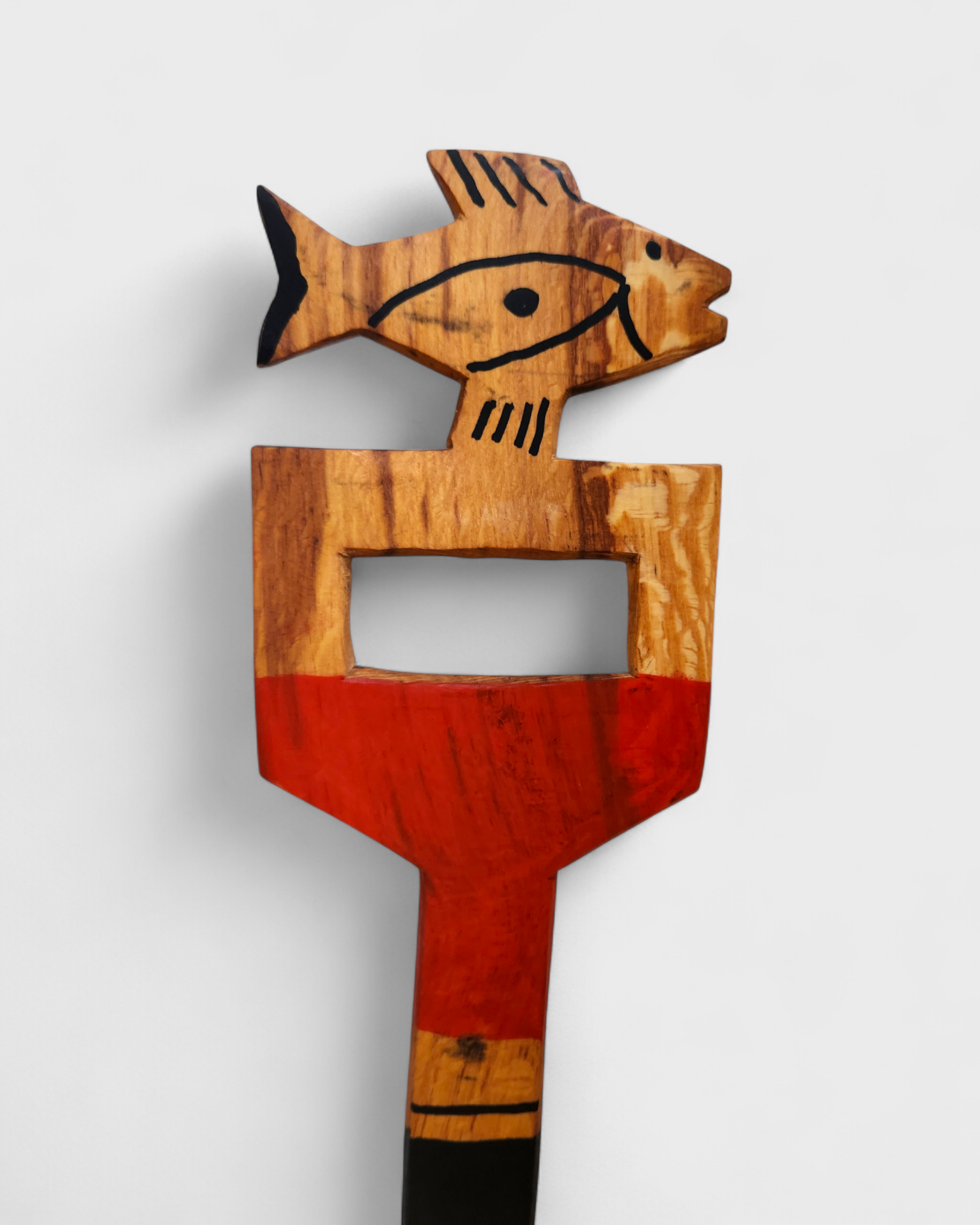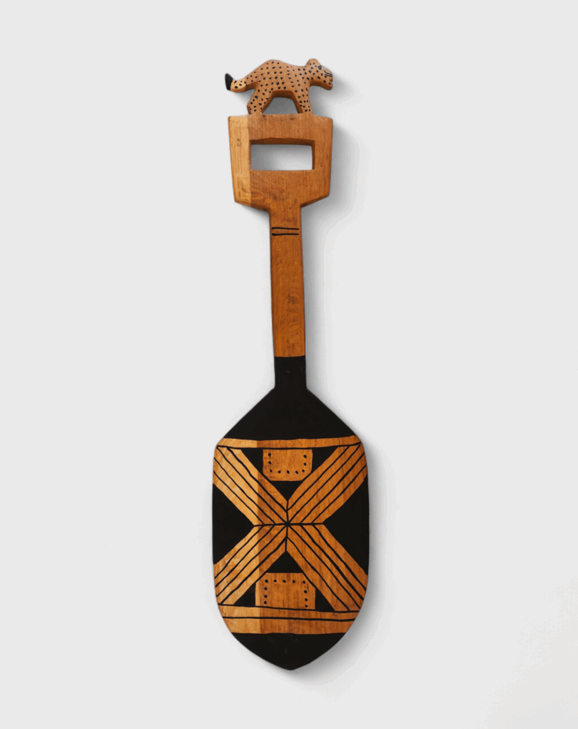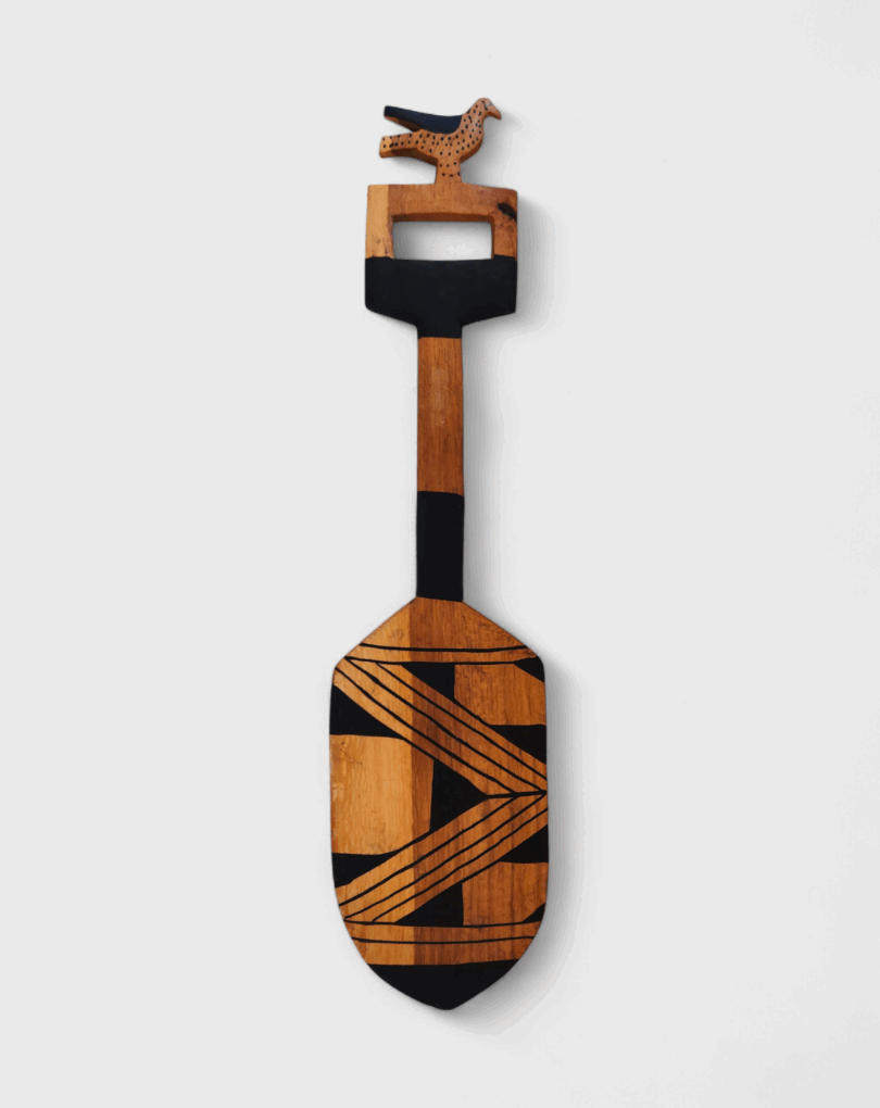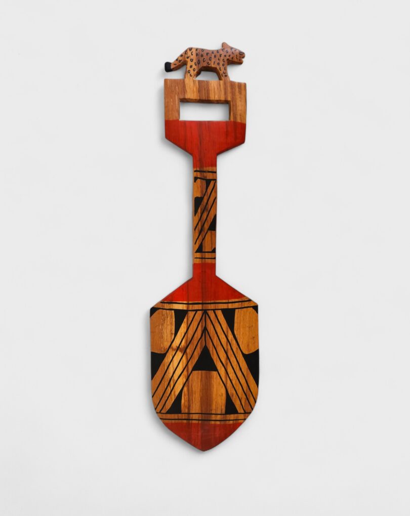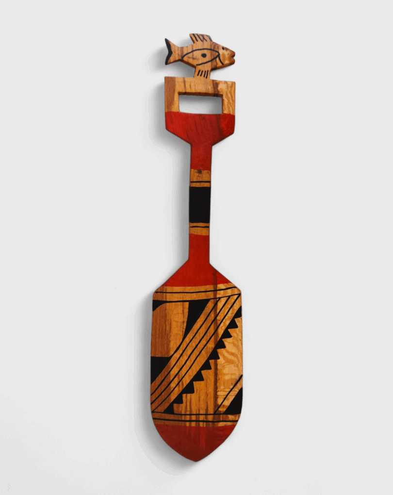 Remo esculpido em madeira pelos Mehinako, povo do Alto Xingu conhecido por sua rica tradição gráfica. Decorado com pintura de grafismos indígenas, cada traço expressa identidade, memória e espiritualidade. No cabo, o entalhe de um animal evoca a força e a presença dos seres da floresta, guardiões de poder e sabedoria. Mais que objeto, é uma obra que une utilidade, beleza e resistência cultural, traduzindo a conexão entre arte, natureza e ancestralidade. [Cód. 3211]