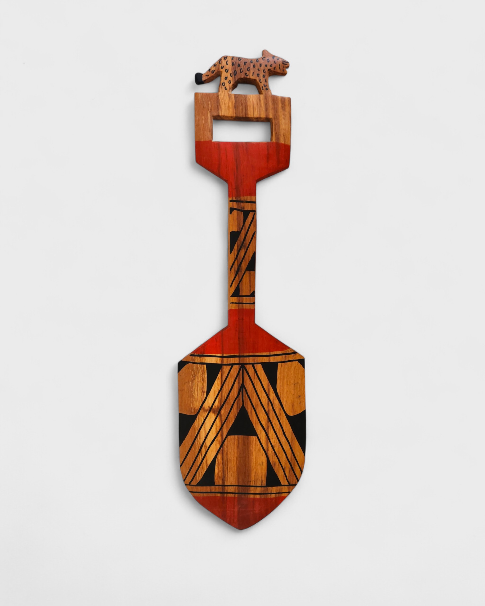 Remo esculpido em madeira pelos Mehinako, povo do Alto Xingu conhecido por sua rica tradição gráfica. Decorado com pintura de grafismos indígenas, cada traço expressa identidade, memória e espiritualidade. No cabo, o entalhe de um animal evoca a força e a presença dos seres da floresta, guardiões de poder e sabedoria. Mais que objeto, é uma obra que une utilidade, beleza e resistência cultural, traduzindo a conexão entre arte, natureza e ancestralidade. [Cód. 3209]