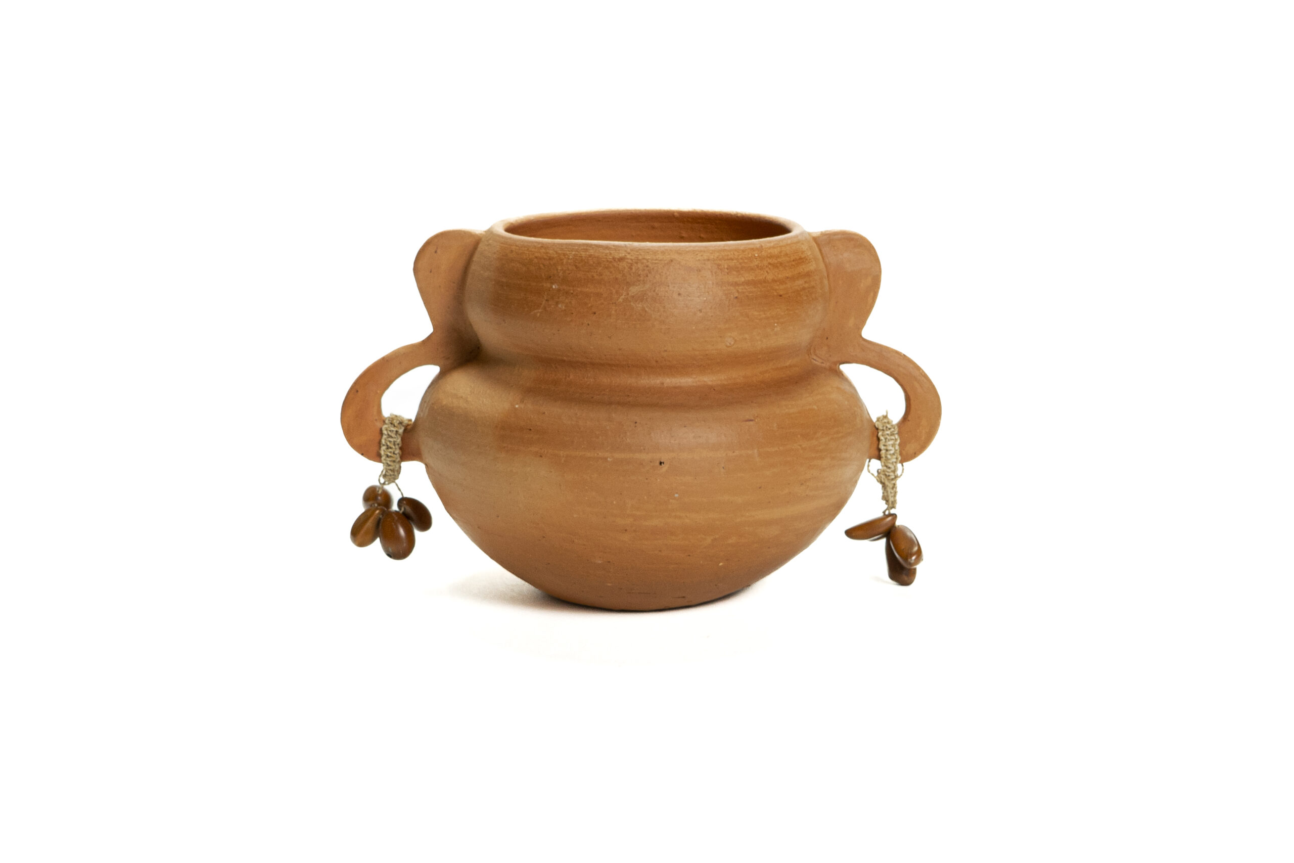 Vaso de cerâmica em barro criado por Jefferson Paiva, de Santarém (PA). A peça apresenta forma simples e funcional, com acabamento liso e pequenas “orelhas” laterais que funcionam como alças. Em tom terroso natural, valoriza a estética rústica e a conexão com a terra, serve e compõe ambientes através da arte feita à mão.