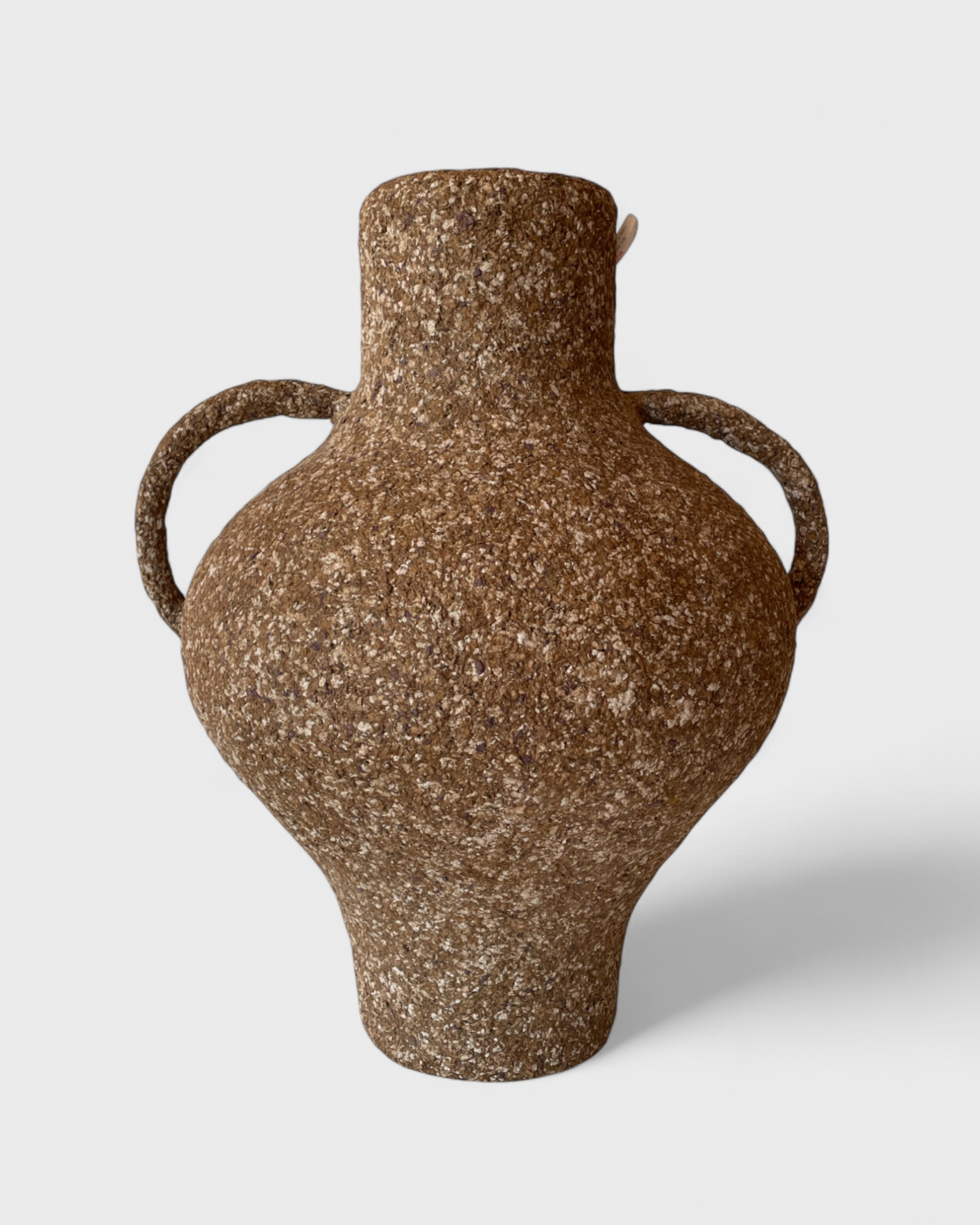 Vaso de papel machê criado por Vilma Ferreira da Silva Santos, de São José do Rio Claro (MT). Com corpo volumoso, pescoço estreito e duas alças curvas, apresenta textura granulada e tom terroso que evocam a natureza. Produzido artesanalmente a partir de papel reaproveitado, une leveza e resistência, transformando material simples em peça decorativa. [Cód. 3089]