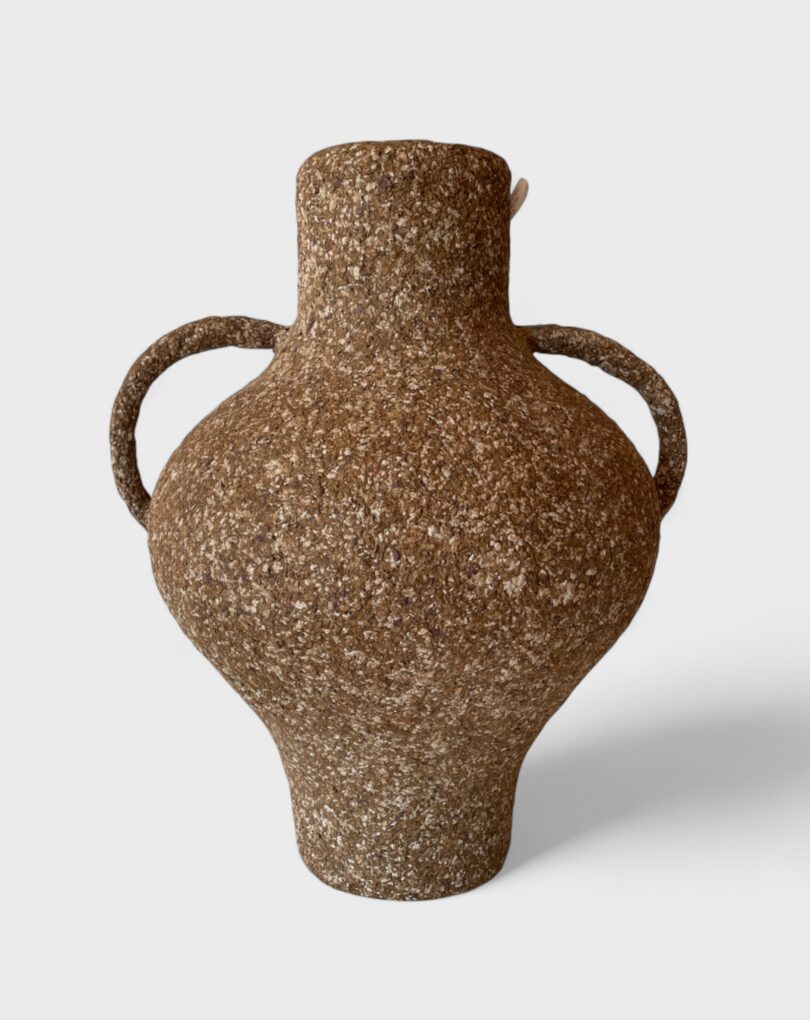 Vaso de papel machê criado por Vilma Ferreira da Silva Santos, de São José do Rio Claro (MT). Com formato alongado e superfície texturizada, apresenta tonalidade terrosa que remete aos elementos naturais. Leve e resistente, resulta de um trabalho artesanal que une sustentabilidade e expressão estética, transformando papel reaproveitado em peça decorativa. [Cód. 3088]