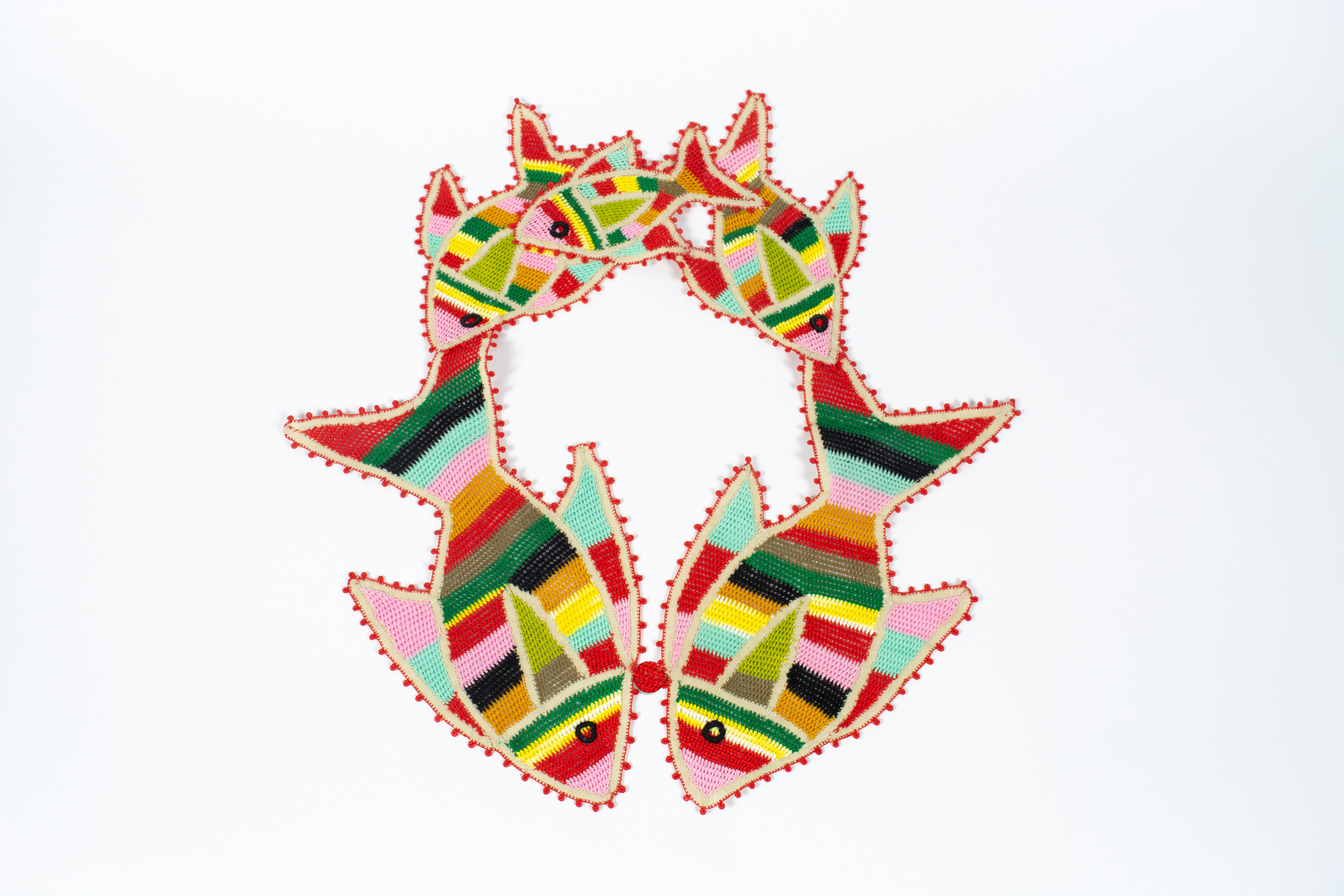 Criados especialmente para o projeto Artiz a partir de uma paleta de cores definida para a coleção, as palas e colares em renda renascença da Renasci configuram verdadeiras joias têxteis elaboradas com fios de algodão. Tiras delicadas, produzidas com a mesma técnica, sustentam o desenho da renda. Combinando pontos tradicionais como dois amarrados, pipoca, abacaxi, sianinha e traça, as rendeiras criam composições que transformam a tradição em acessórios autorais. O resultado são colares sofisticados e profundamente enraizados na herança cultural da região.